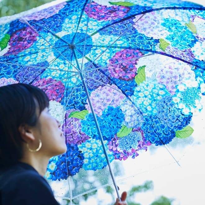 雨の日を美しいグラデーションで彩る紫陽花を、空いっぱいに広げて思う存分堪能できる傘です。繊細で、ていねいに描かれた紫陽花のリアルなイラストを透明傘にのせているので、外から見れば紫陽花の花束のよう。内側から見上げれば、まるで紫陽花が空から咲きこぼれてくるような気分が味わえます。