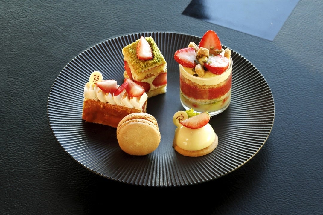 ライムとパッションフルーツの爽やかな香りが特徴で、ホワイトチョコレートムース、イチゴとルバーブのコンポート、ライムゼスト入りパッションフルーツ風味のビスキュイ、パートサブレが層になった、軽やかでフルーティーな味わいが魅力の『バヤデール』、パッションフルーツ入りマスカルポーネクリーム、イチゴとルバーブのコンポートのほんのりした甘酸っぱさの『ミルフィユ セレスト』など全5種類をお愉しみいただける一皿です。