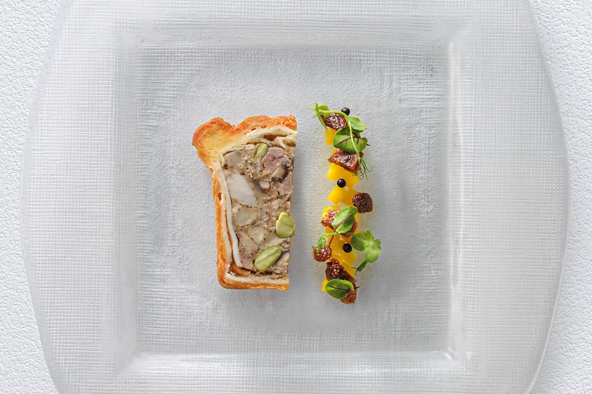 フランスの伝統料理「パテ・アン・クルート」は、あわじ田助鴨、淡路産えびすもち豚、フォアグラ、白肝のムースに、ポルチーニやシャンピニオンなどの茸、枝豆、玉葱など、さまざまな素材の風味と食感が多層的に重なる重厚なパテをパイ生地で覆い焼き上げたシェフ渾身の一皿です。魚料理は、バターをかけながらしっとりと仕上げる淡路近海産平目のグリル、メインはきめ細かな肉質の淡路牛フィレ肉とフォアグラを合わせた肉料理で、マデラワインとトリュフソースの芳醇な香りが淡路牛の奥深い旨味を引き立てます。