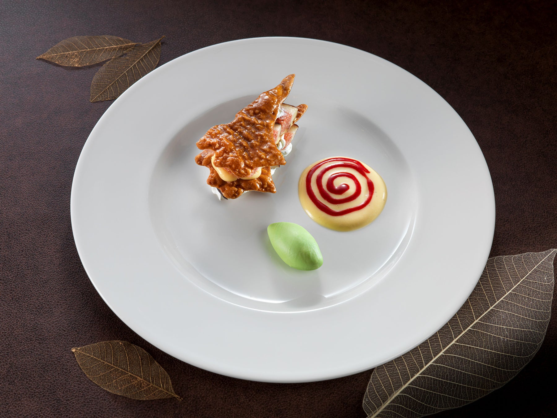 和洋の両コースでご提供するデザートは、国生み神話の舞台・淡路島をモチーフにしたパティシエ考案の一皿で、島を象った淡路産いちじくのミルフィーユに、淡路島の卵と牛乳を使用したアングレーズソースとラズベリーのクーリで鳴門海峡の渦潮を表現しています。