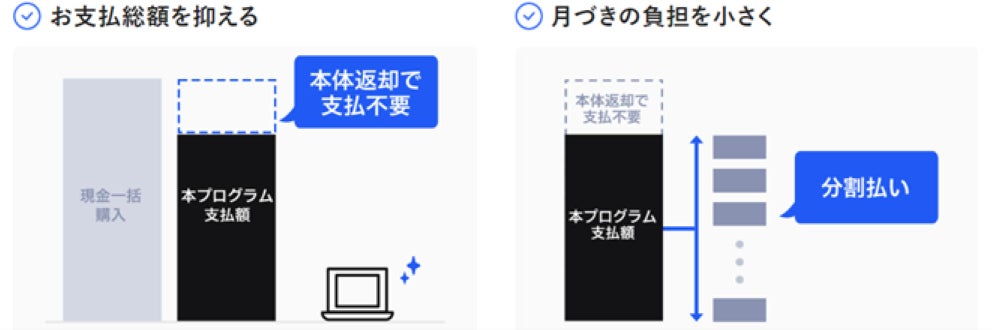 本プログラムは、利用期間終了後に端末を返却することを前提として、残存価値をあらかじめ除いた金額でApple端末を購入することができ、お支払いは利用期間内の分割払いとなります。Apple端末の高い残存価値を反映したプログラムとなっており、月づきのお支払額とお支払総額の両方を抑えることができます。