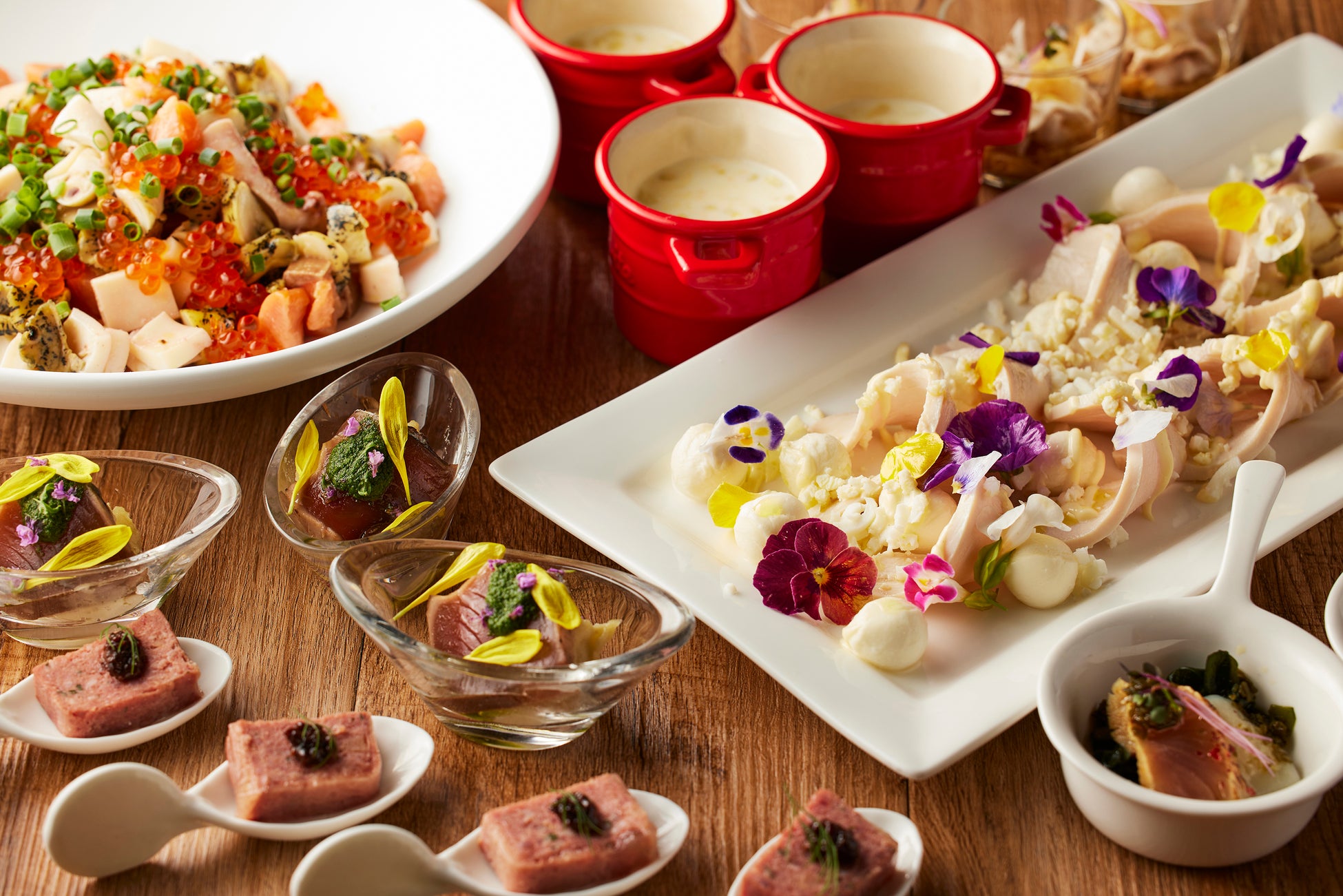 GARDEN DININGの定番でもあるローストビーフは、北海道産の牛もも肉をシェフサービスにて提供します。ソースにも北海道産のハスカップと山わさびを使用し、付け合わせにはインカのめざめをご用意しました。その他、スモークした秋鮭と浜茹でしたツブ貝などの海鮮を、さっぱりとしたライム果汁でマリネし、イクラを添えた冷製料理や、低温でしっとりと焼き上げた後に表面をグリルした、ジューシーで甘みのある北海道産雪国ポークなど、北海道の美食をお好きなだけ召し上がりください。また、酪農も盛んな北海道のクリームチーズや生クリームを使用したケーキ、名産であるハスカップのパンナコッタなど、スイーツにも北海道の恵みが詰まったラインアップを取り揃えました。