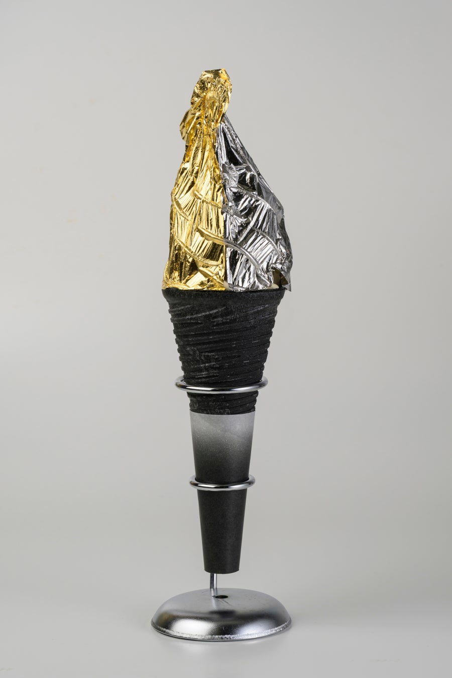 お茶の油谷「加賀棒ほうじ茶ソフトクリーム」に、金箔屋さくだ「純金箔」「プラチナ箔」を大胆にのせた”金沢伝統文化”夢のコラボレーションです。