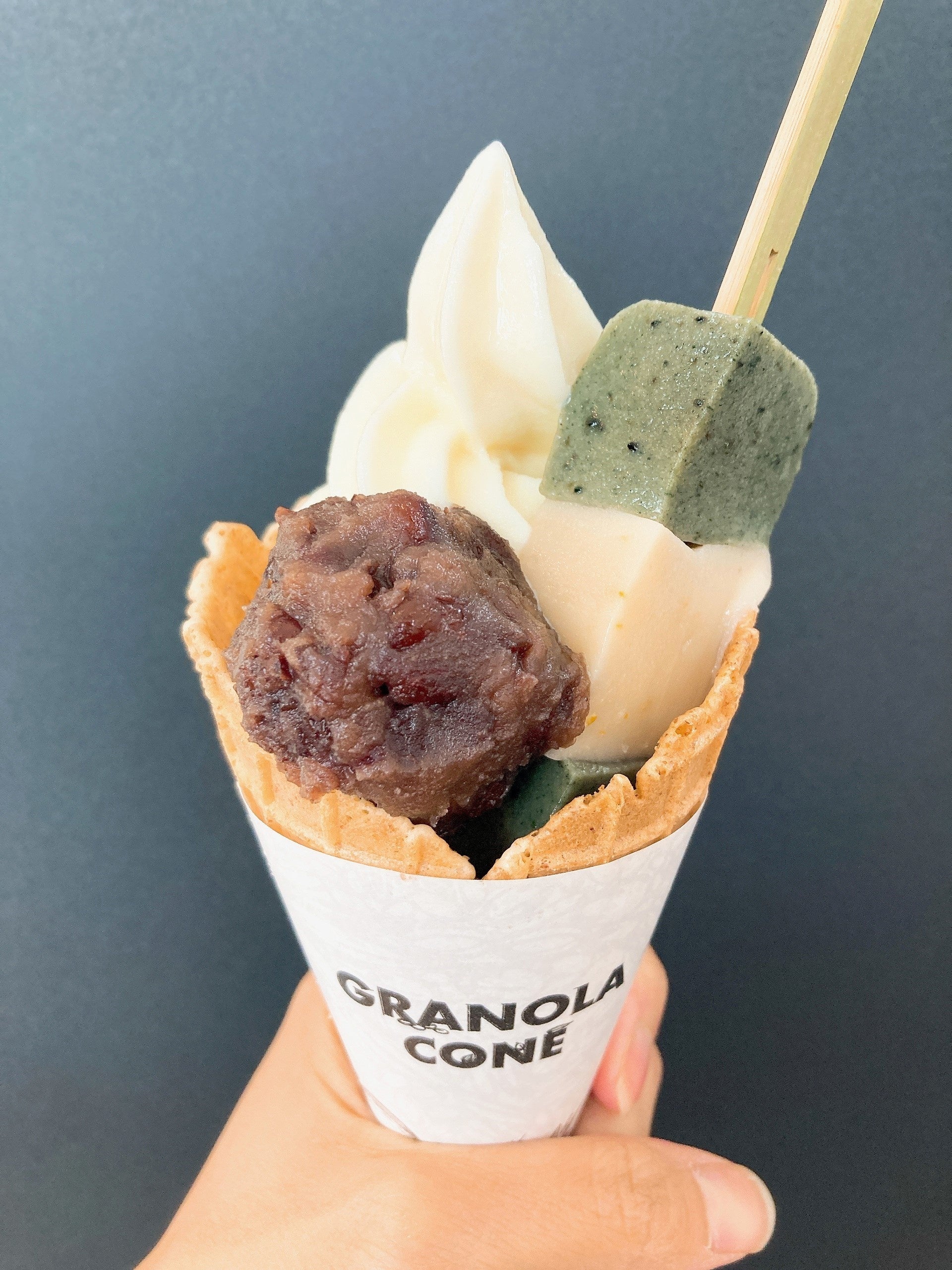 北海道生乳を使用したミルクソフトに、蓬と柚子の生麸とつぶあんをトッピング。
