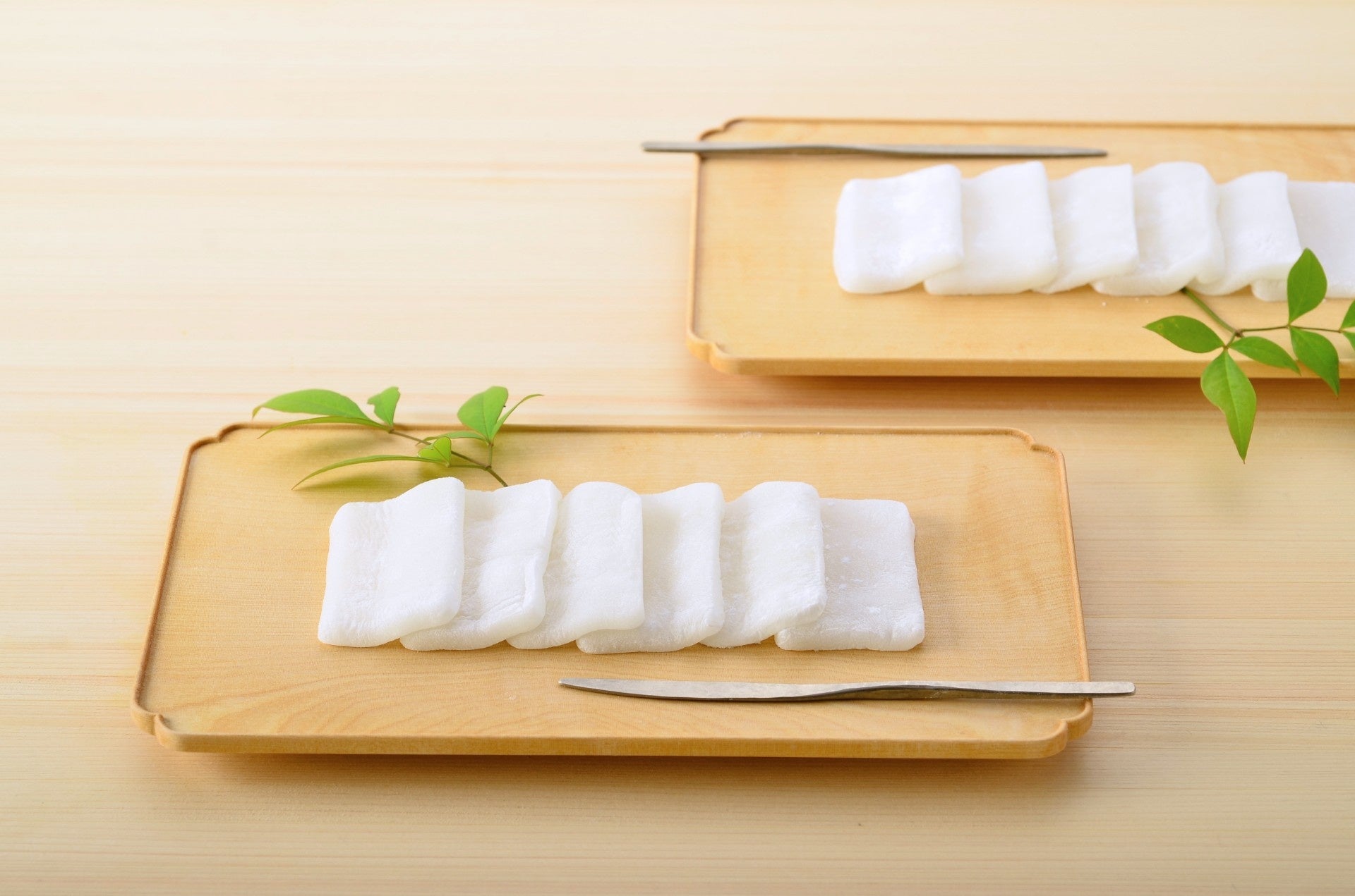 絹の風合いを和菓子で表現した羽二重餅の元祖。保存料や添加物は不使用です。口に含めば、ふわりととろけ、ほんのりともち米の優しい甘さが広がる餅菓子です。