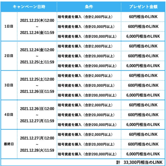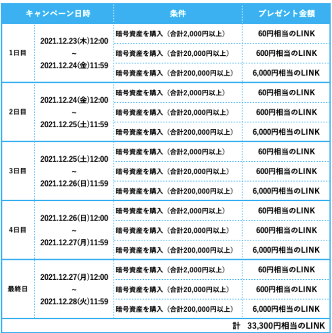 プレゼントの内容: キャンペーン終了までの5日間、毎日キャンペーンに参加いただくことが可能です。ただし、本キャンペーンにより付与するLINKの1日の付与上限は2000万円相当です。付与されたLINKが付与上限に達した場合、その日のキャンペーンは終了となります。