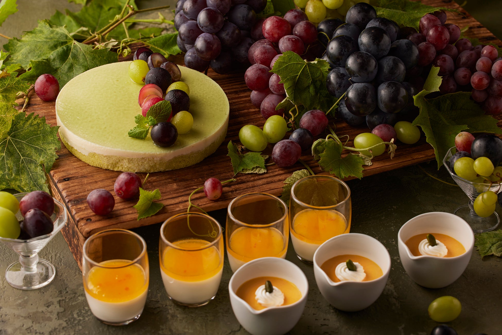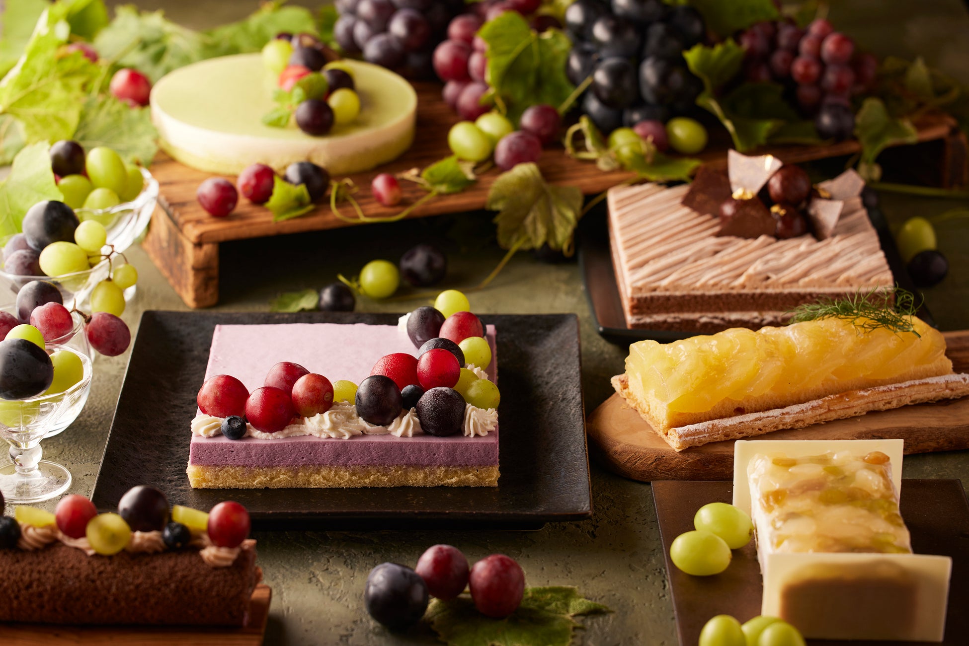 9月1日(日)より開催する『秋のプリフィックスランチ』では、秋の収穫祭「ぶどう狩り」をテーマに、さまざまな秋の味覚を心ゆくまで堪能できるデザートブッフェを提供します。メインとなる「ぶどう食べ放題」では、高級品種として名高いシャインマスカットや長野パープルなど、みずみずしい4種類のぶどうをお好きなだけお召し上がりいただけます。シェフサービスの「トリュフ風味のモンブラン」では、芳醇な香りのトリュフを織り交ぜた濃厚なマロンペーストを目の前で絞るパフォーマンスをご用意しています。視覚と味覚の両方でお楽しみください。その他「ぶどうと洋梨のケーキ」や「シャインマスカットムース」などのぶどうスイーツのほか、「スイートポテト」や「マロンカスタード」「かぼちゃプリン」など、芋・栗・南瓜をはじめとした秋の味覚をお楽しみいただけるデザートが勢揃いします。