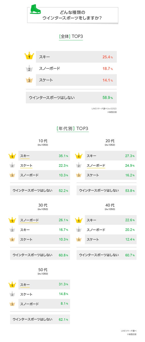 【LINEリサーチ】ウインタースポーツでは「スキー」をするという回答が1位、「スケート」は他の年代と比べて10代での割合が高い傾向に