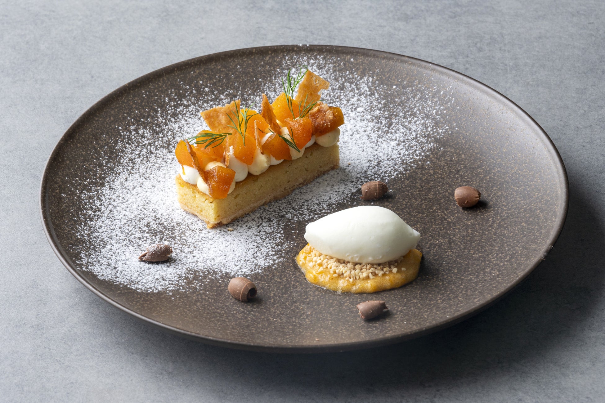 デザートメニューでは、福島県の名産である「あんぽ柿」を使った「あんぽ柿のタルト」をご用意。その濃厚な甘さを引き立たせるためにレアチーズとカスタードの2種のクリームを添え、より風味が増す逸品に仕上げました。