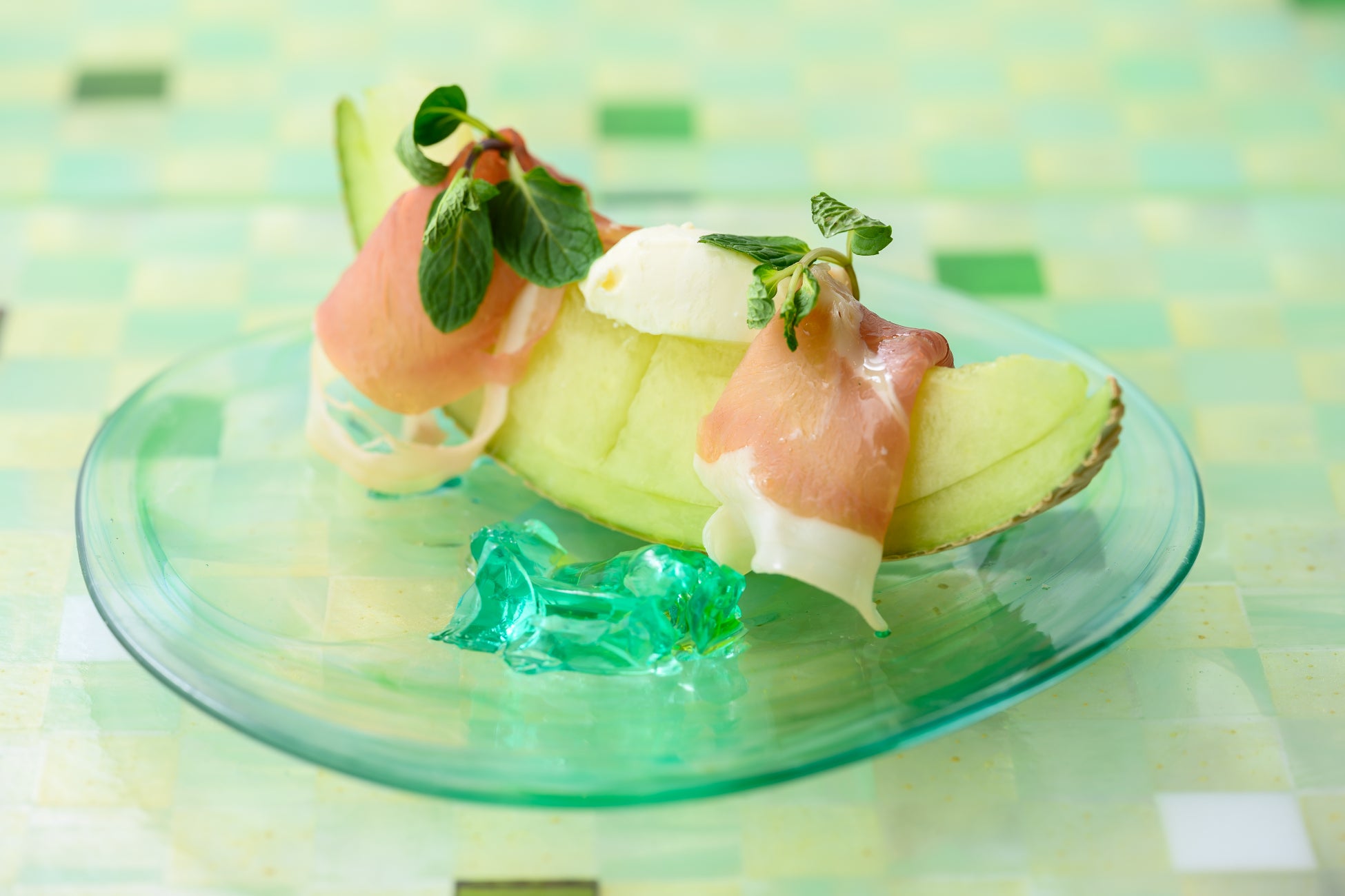 〈サイドディッシュ〉・生ハムメロン リコモンテスタイル ~マスカルポーネと蜂蜜、ミントのマリアージュ~・メロンクロッフル 発酵あんことご一緒に