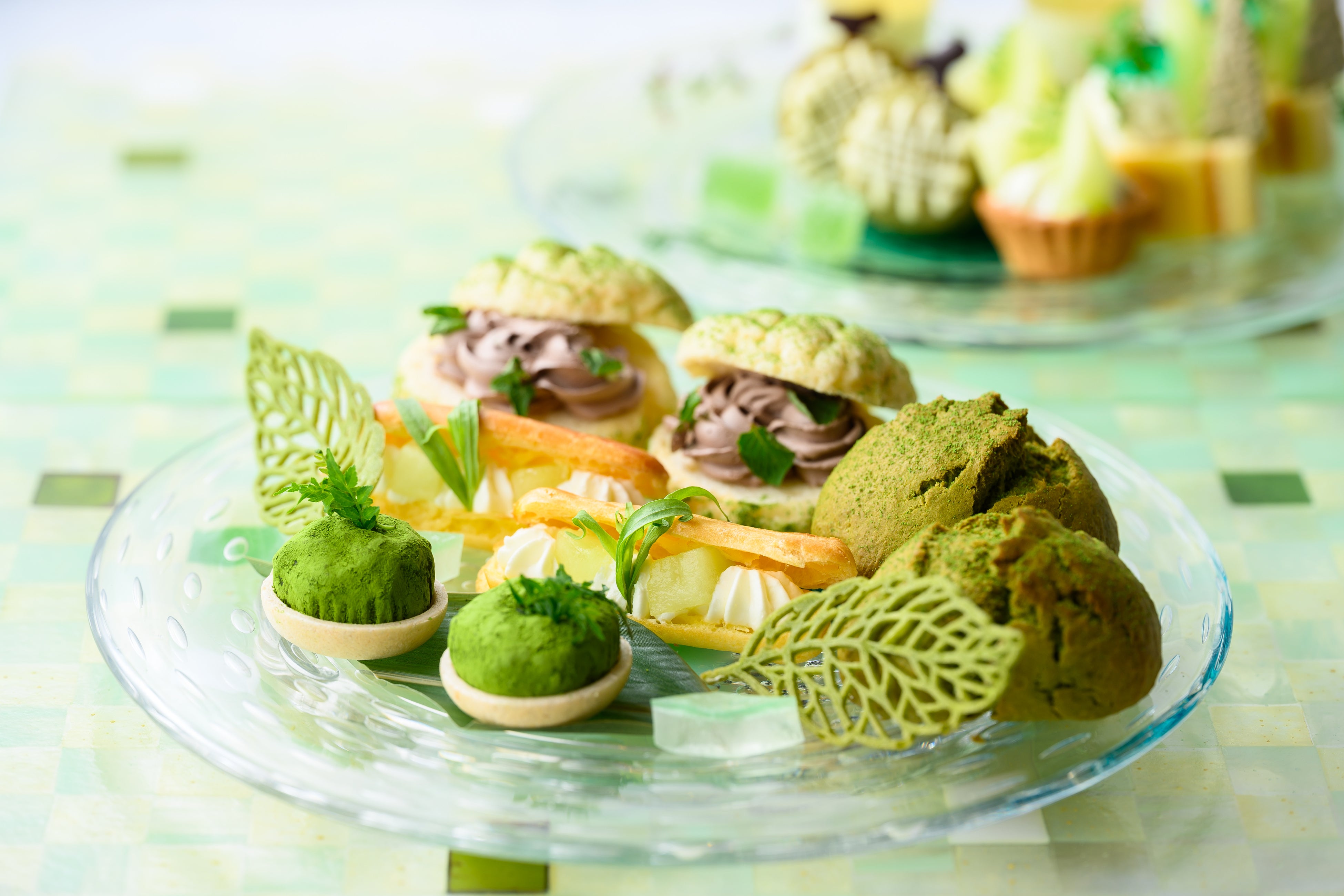 ティースタンドには、10種類のスイーツが並びます。口当たりのよいパンナコッタに瑞々しいメロンのジュレと、爽やかなディルを合わせてさっぱりと仕上げたグラスパフェや、フレッシュなメロンに上品でスパイシーな風味が魅力のタラゴンを合わせ、大人っぽい味わいに仕上げたエクレア。そしてコク深いチョコレートの味わいとミントの清涼感の絶妙なバランスがクセになるチョコミントメロンパンなど、ハーブの香りと食材の相性にもこだわりました。他にもよもぎを練り込んだサクサクのスコーンや、スパイシーで爽やかな香りの木の芽をアクセントにしたメロンタルトなど、和ハーブを取り入れたメニューも魅力です。