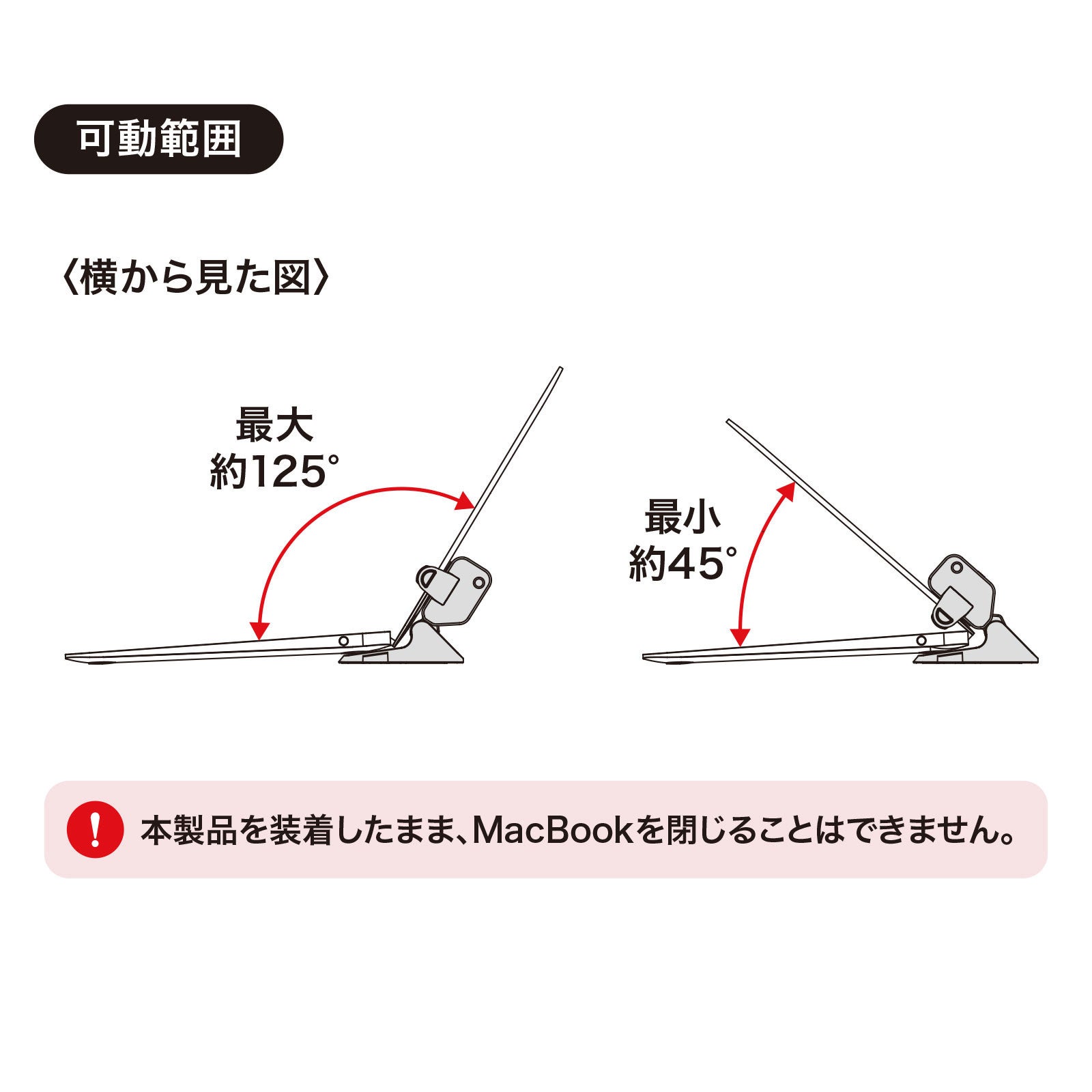 本製品取り付け後のMacBookの画面可動範囲は45~125度です。