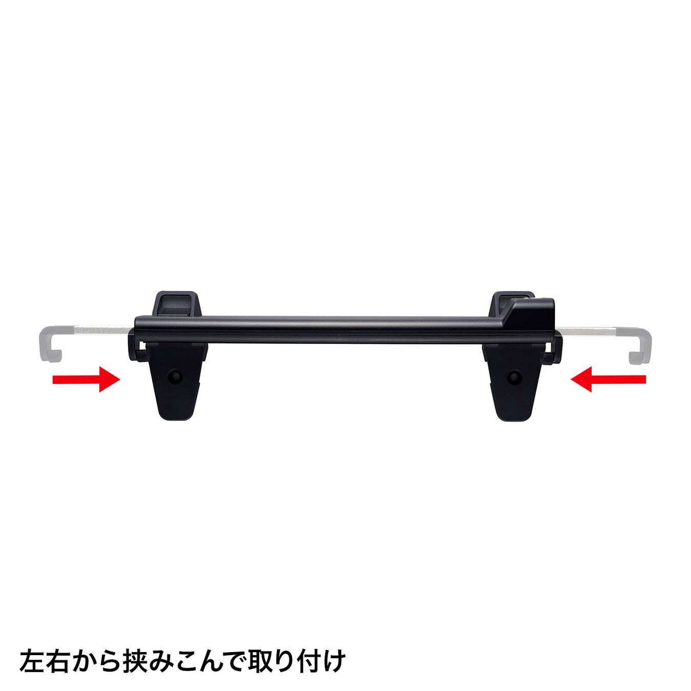 取り付け方は簡単で、MacBookの画面背面部を本体パーツで左右から挟み込み、それにワイヤーを取り付けて机の脚などに巻き付けます。