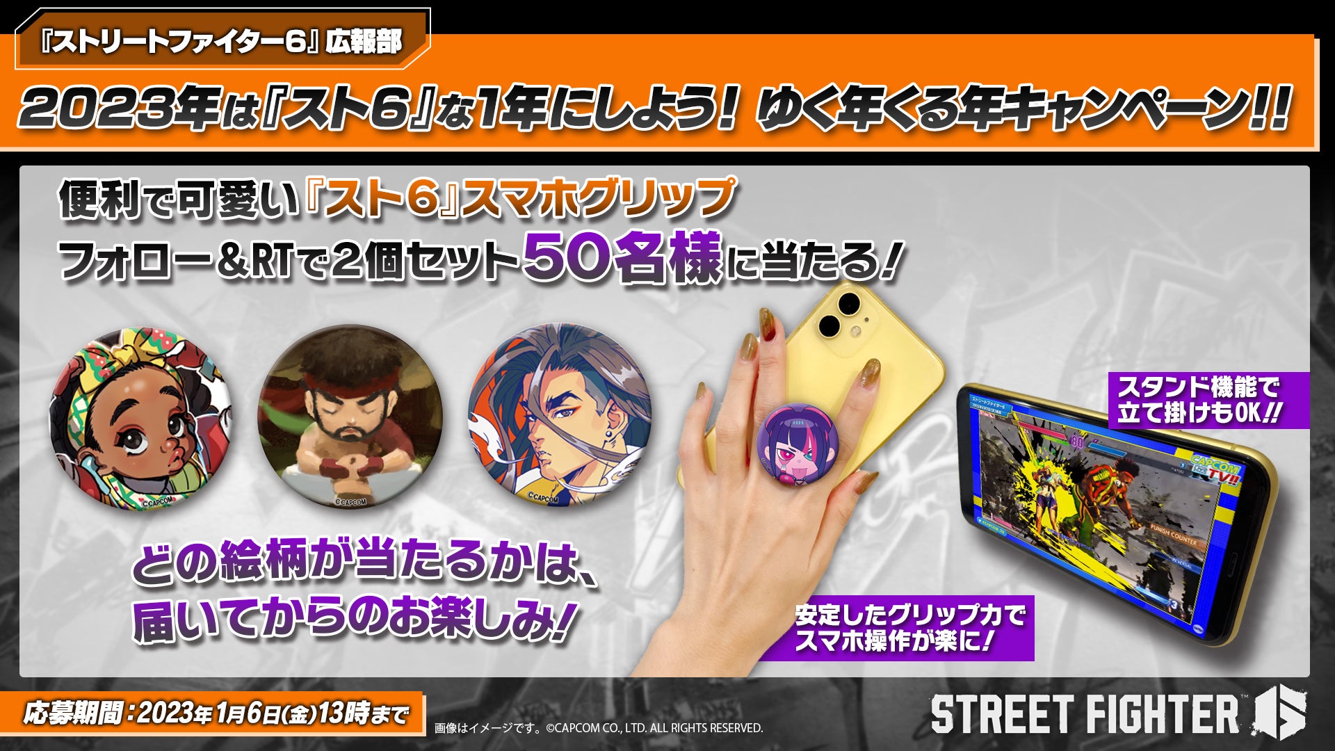 「ストリートファイター6 広報部」Twtiter(@SF6_PR)をフォロー&キャンペーンツイートをRTでオリジナルスマホグリップを抽選で50名様にプレゼント!