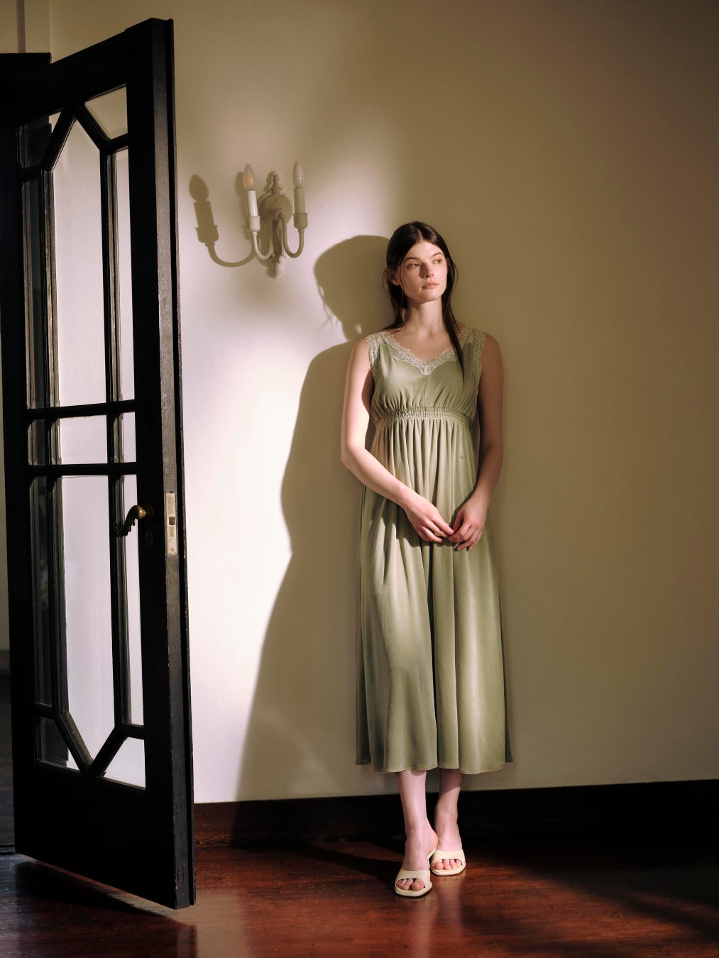 ワンピースとタンクトップには胸元にレースが、ロングパンツは裾にレースが施されており、身に纏うたびに、ロマンティックな気分に包まれる一枚です。