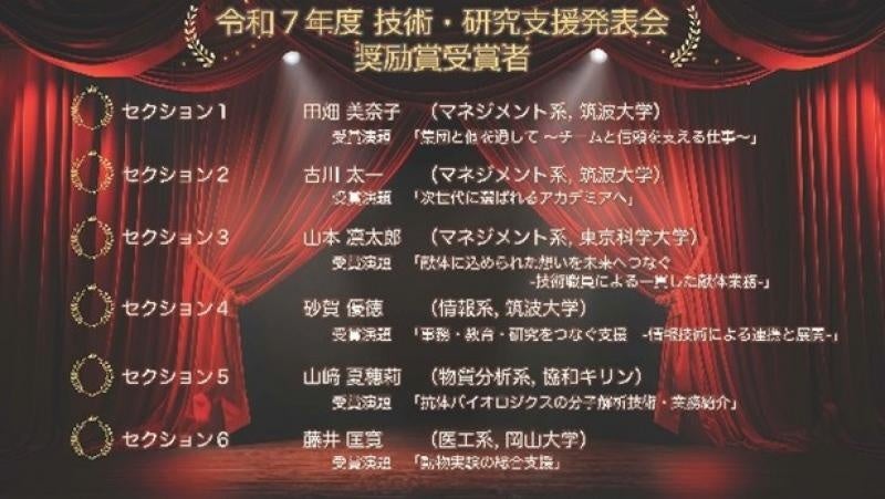 国立大学法人岡山大学(本部:岡山市北区、学長:那須保友)技術統括監理本部のひとつである総合技術部の機器分析・動植物資源技術課の藤井匡寛技術専門職員が2025年10月15日、東京科学大学で開催された「令和7年度TCカレッジ技術・研究支援発表会受賞式」(ハイブリッド開催)にて、「奨励賞」を受賞しました。
