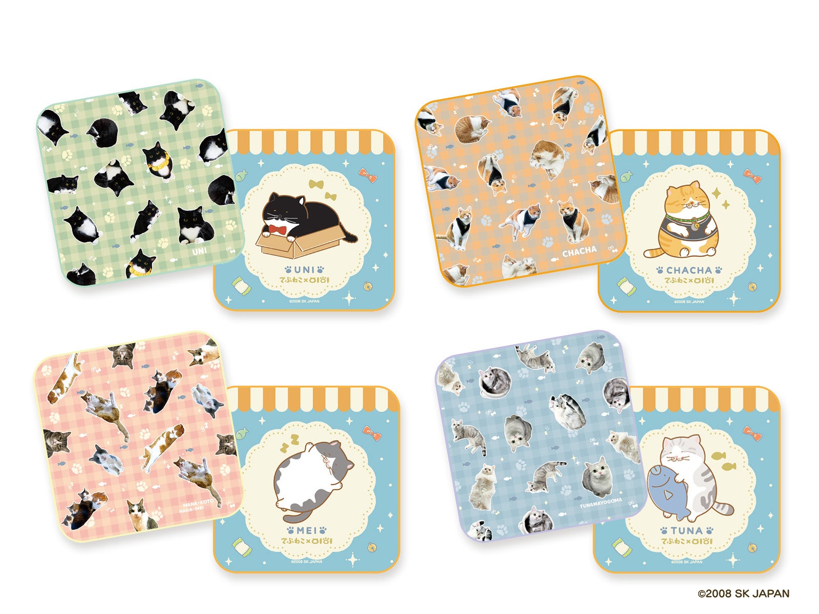 さまざまなショットの猫ちゃんを散りばめたデザインと、イラストデザインの2枚セット!