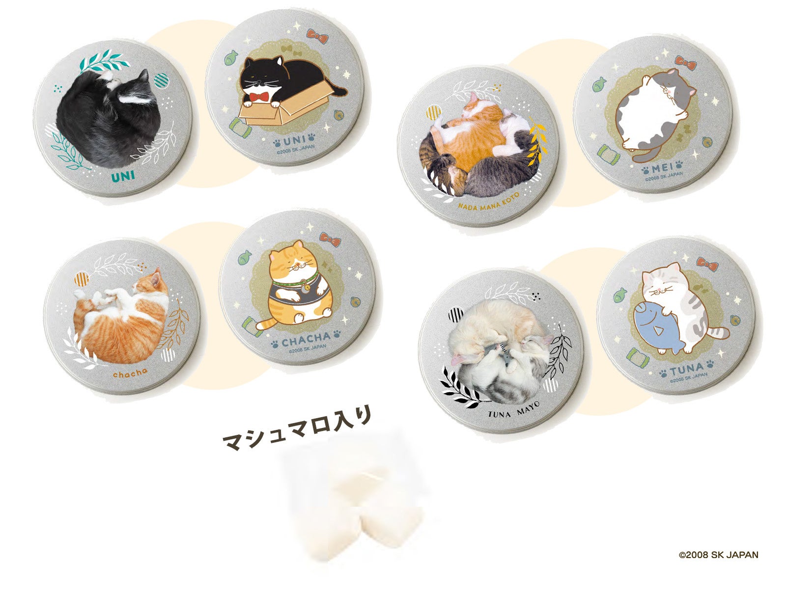 マシュマロ入りの丸い缶はマルイコラボとかけて”丸く”なった猫ちゃんデザイン。ご自宅に猫ちゃんがいたら紙袋で遊んでくれる…かも!