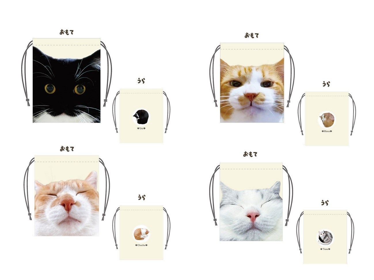 猫ちゃんのお顔が前面にプリントされた巾着。中身を入れると立体感が出てかわいい!