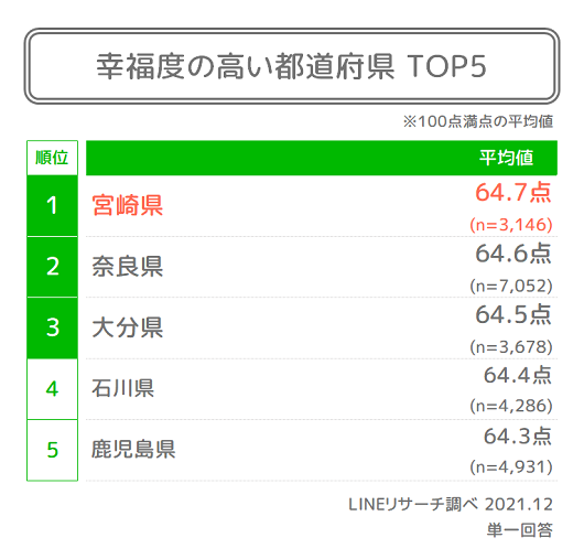 2021年度を振り返って、ご自身の「幸せ度合い」を0点~100点満点で自己採点していただきました。今年はすべての都道府県で幸福度のスコアが増加傾向にありました。 幸福度の高い都道府県をみると、昨年、4位の宮崎県が1位に。奈良県、大分県が上位ランクインしています。一方、昨年TOP3に入っていた鹿児島県、沖縄県、福井県は5位以下となりました。