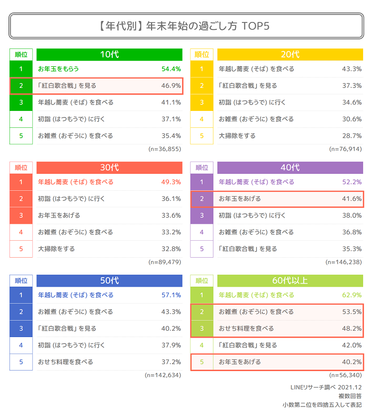 さらに、「大掃除をする」も例年同様に30代以上で3割超え、60代以上は他の年代に比べて「年越し蕎麦(そば)を食べる」「お雑煮(おぞうに)を食べる」「おせち料理を食べる」など食関連の項目の割合が高い傾向でした。