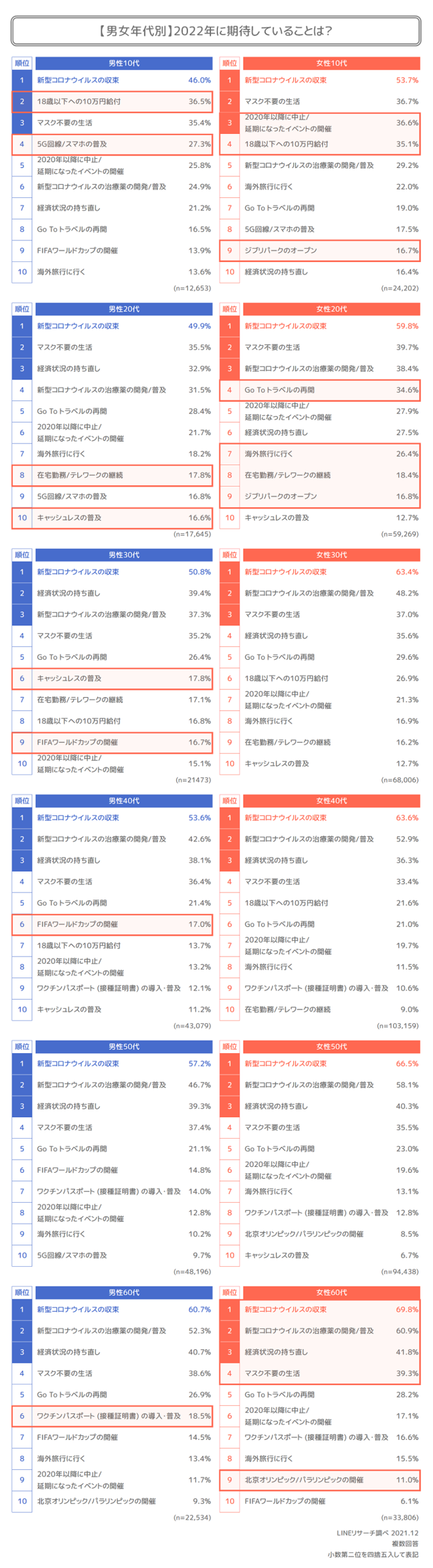 男女ともに20~30代では「在宅勤務/テレワークの継続」が他の年代に比べて高い傾向となっています。「FIFAワールドカップの開催」は全体的に男性の期待が高く、その中でも30~40代がやや高い結果でした。