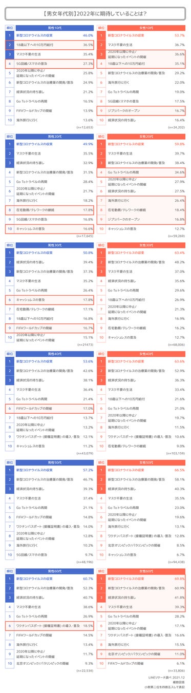 また、女性10~20代では「ジブリパークのオープン」がランクイン。10代、30~40代では「18歳以下への10万円給付」に期待があるようです。給付対象である家族や自身が含まれる層で関心が高まる項目といえそうです。