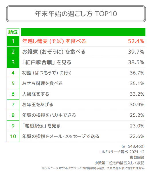 【LINEリサーチ】年末年始の過ごし方は「年越し蕎麦を食べる」が1位に、「初詣に行く」は昨年よりも増加傾向 2022年は「良い年になると思う」が約6割。期待することは昨年同様にコロナ収束関連が上位