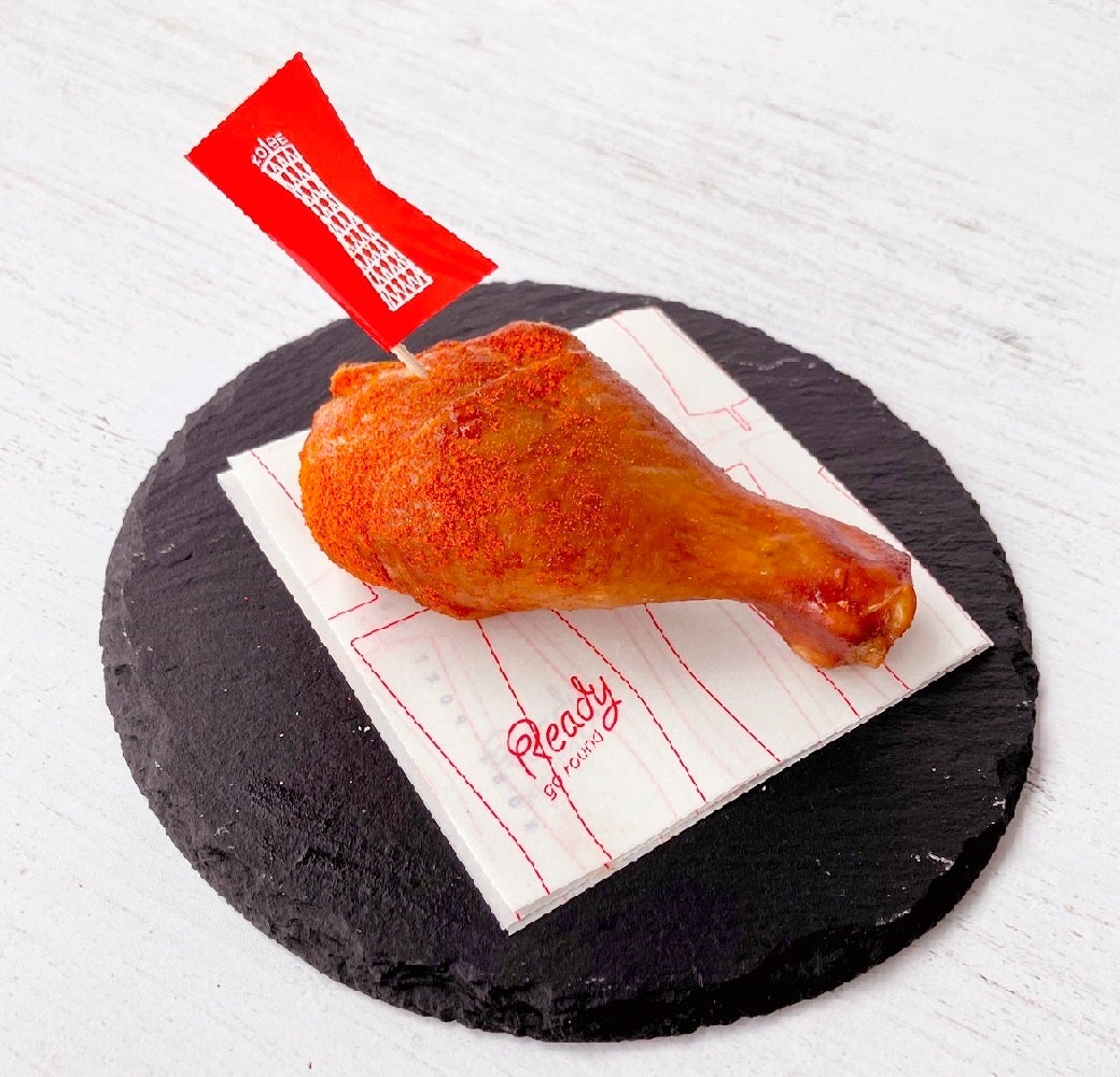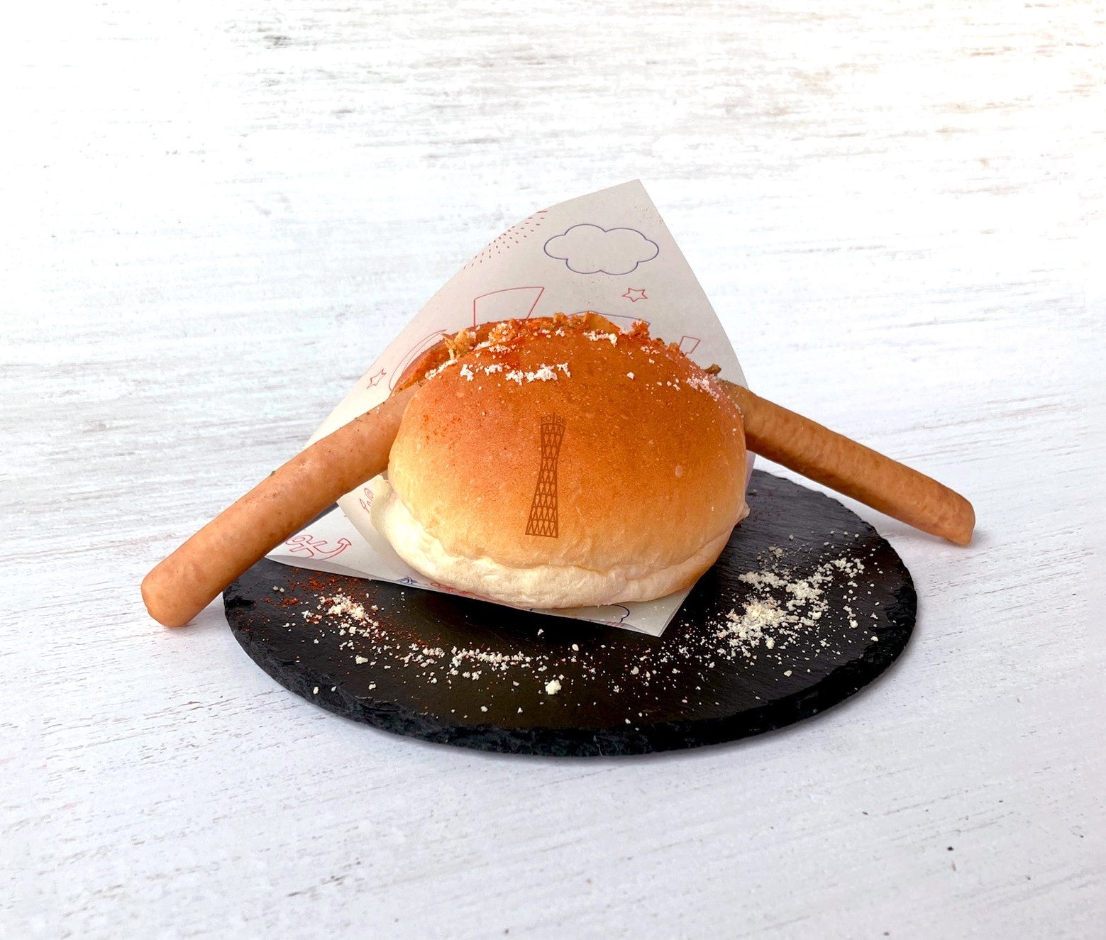 長~いソーセージを挟んだホットドックはバンズに神戸ポートタワーの焼き印入りです。ソーセージの長さは約26~27センチなので、108メートルの「神戸ポートタワー」の約1/400スケールです。タワーの色をイメージした赤いオリジナルスパイシーソースは少しピリ辛で、ザワークラウト、フライドオニオンをサンドし、粉チーズがかかっています。