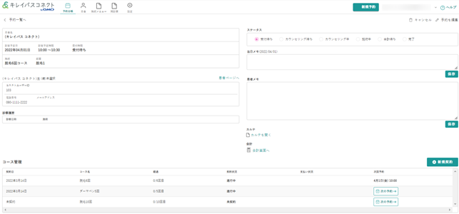 ・患者様毎に、コースの契約状況を「未契約」「契約済み」「進行中」「完了」「キャンセル済み」でステータス管理を行うことができます。