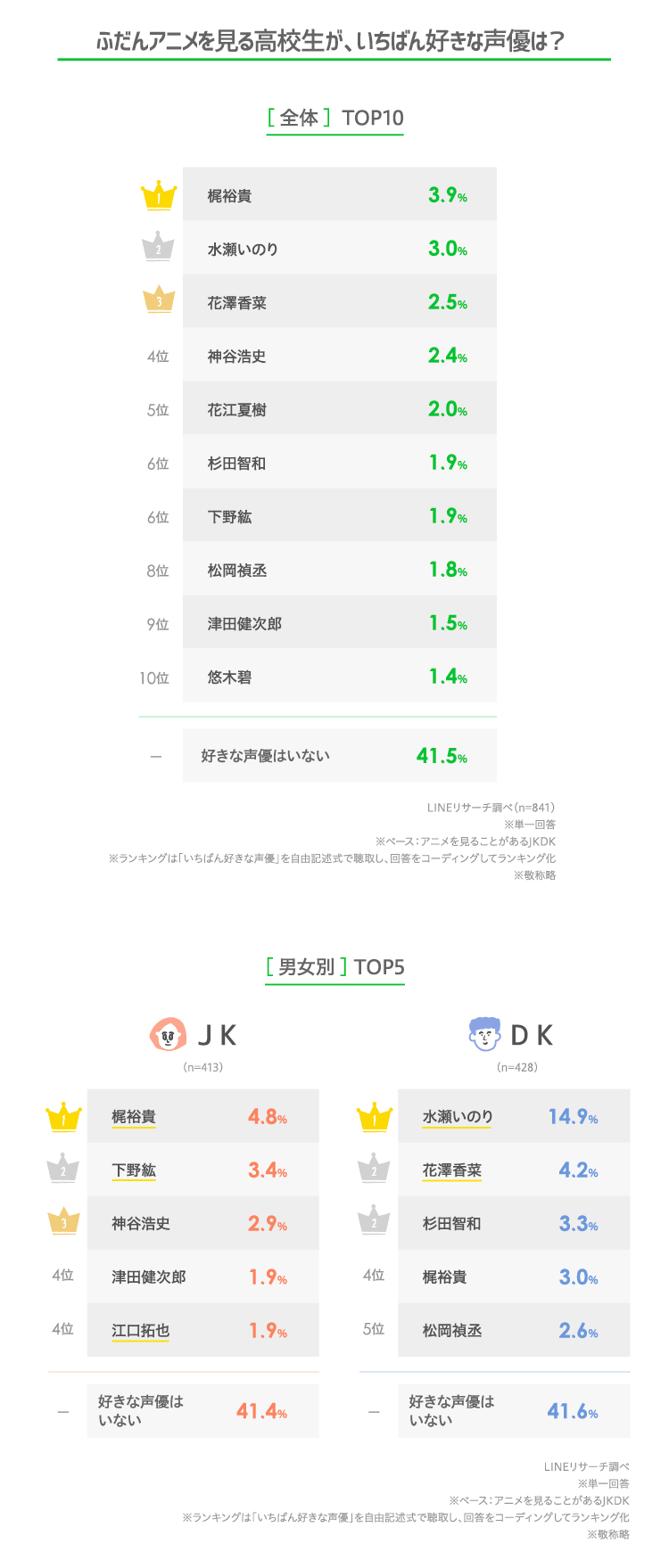 一方の女子高生はTOPが「梶裕貴」、2位は「下野紘」がランクイン。同率4位は「津田健次郎」や「江口拓也」など、いずれも男性声優がTOP5を占めています。