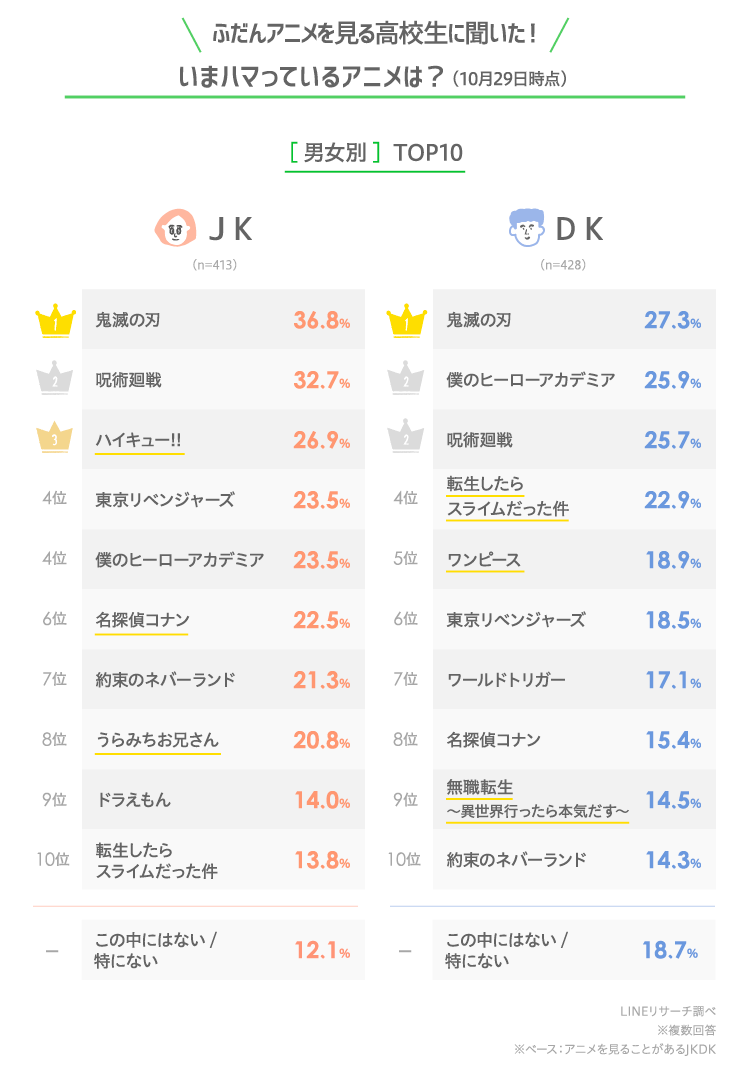 ■いま高校生がハマっているアニメTOPは男女ともに「鬼滅の刃」