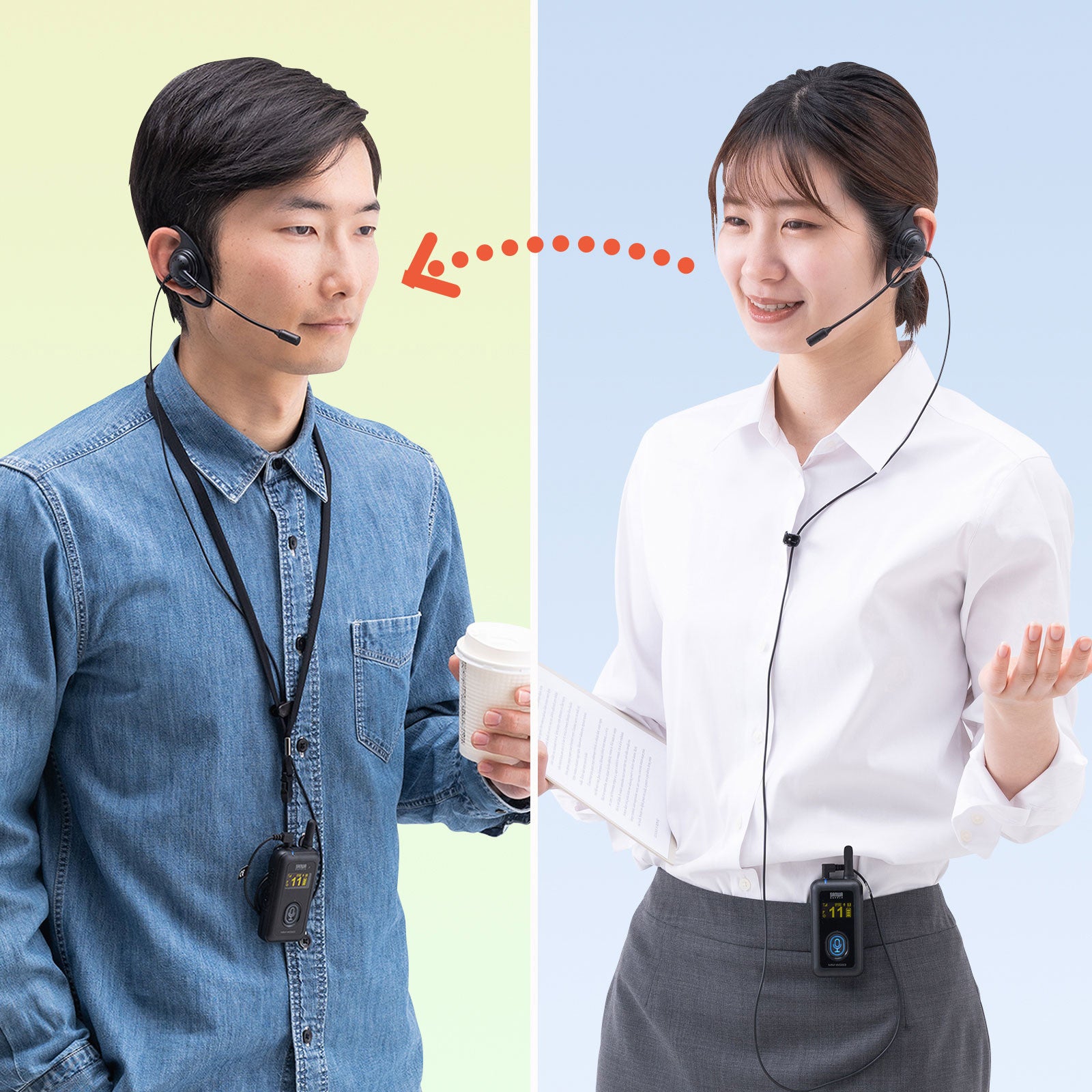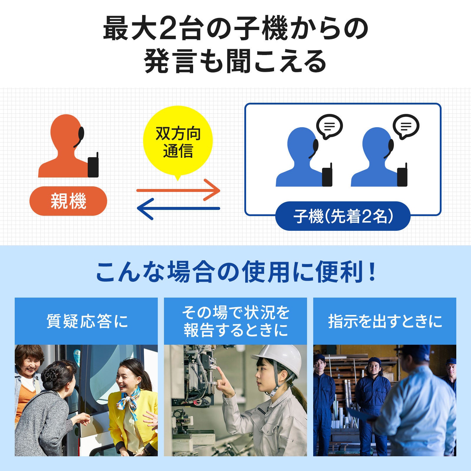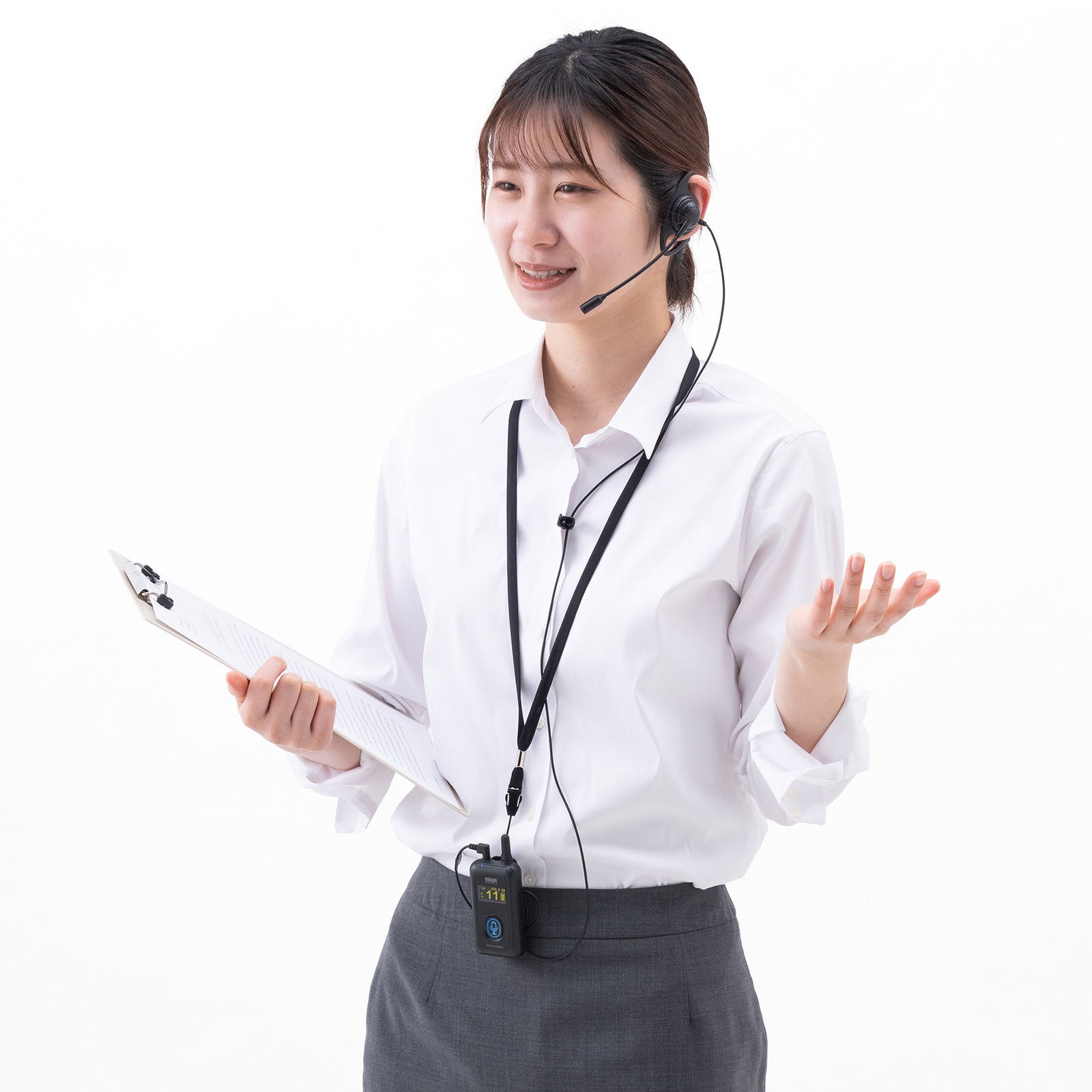 親機に設定した1台から複数の子機へ同時に音声を送ることができます。騒がしい場所でも静かな場所でも、イヤホンマイクを使っていつもの声量でクリアな音声を多くの人に届けられます。ソーシャルディスタンスを保ちながら、ツアーガイドや工場見学、学校の授業、作業現場など、様々な環境・場面で使用できます。