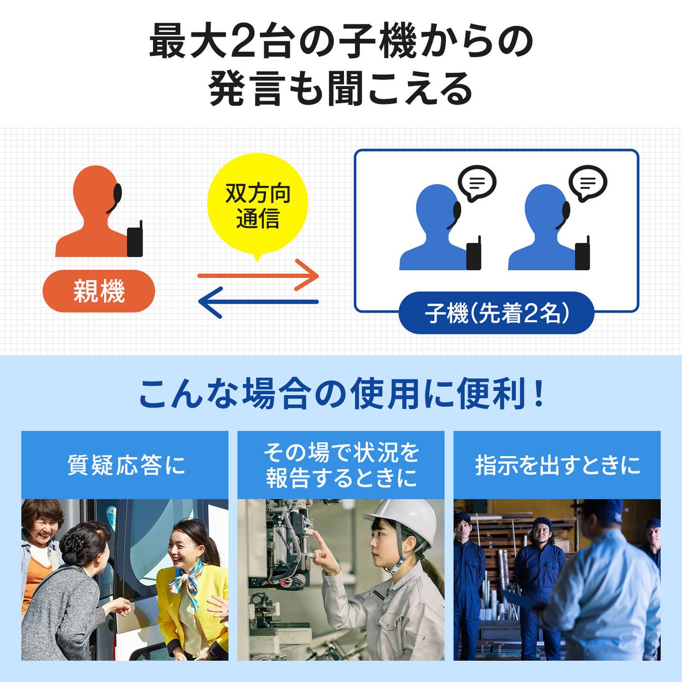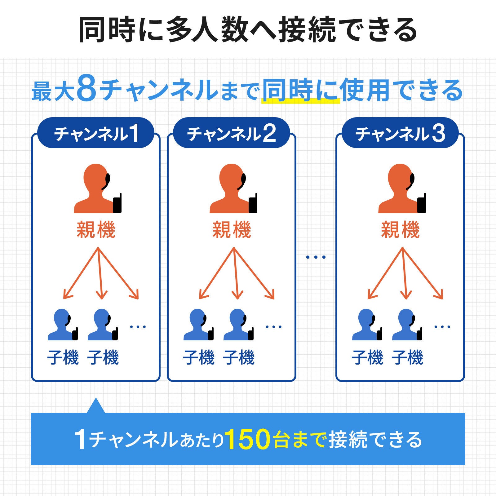 通信距離範囲内では、最大8チャンネル(8グループ)まで同時に使用でき、1チャンネルあたり150台の接続が可能です。簡単設定で親機としても子機としても切り替えて使用でき、発言は親機からだけでなく、先着順で最大2台の子機からも発言できます。