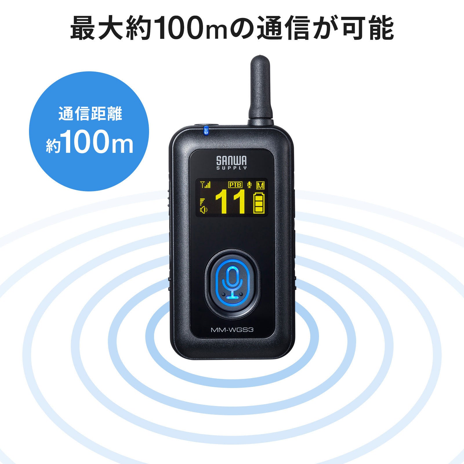 電波干渉の少ないUHFワイヤレスで、安定した音声通信が可能です。通信距離は最大約100m(障害物のない見通しの良い場所は最大約150m)です。