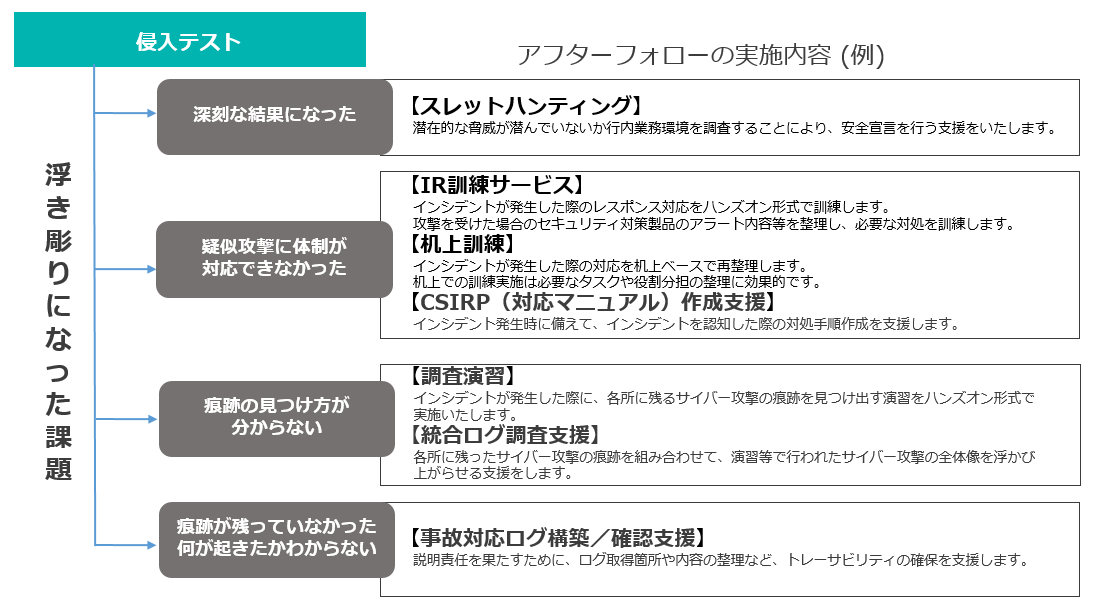 セキュリティアセスメントとペネトレーションテストによって浮き彫りとなった、様々な課題の解決を支援し、状況に応じたアフターフォローを提案・実施いたします。
