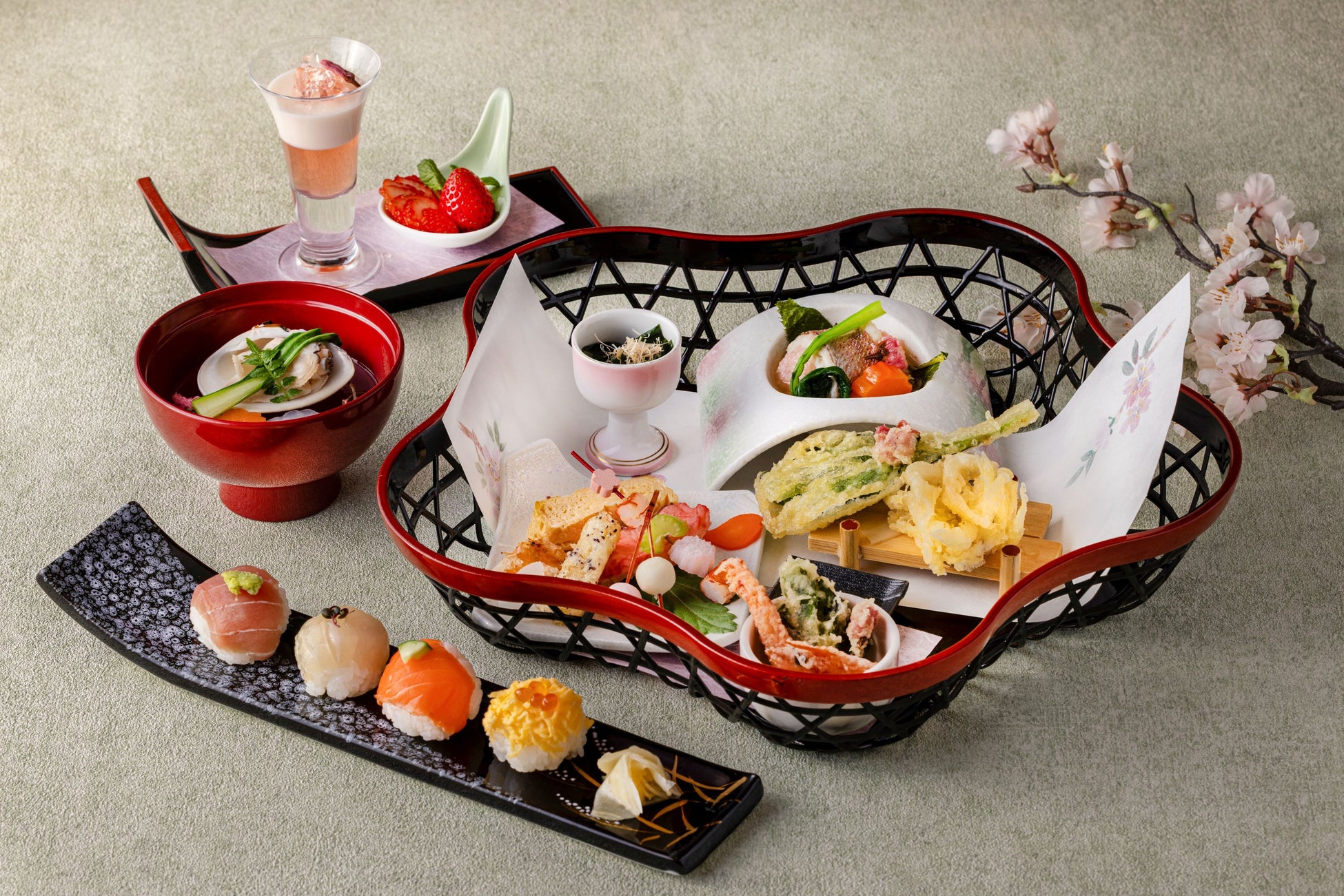 「手毬寿司」や「巻海老桜衣揚げ」、「桜のパンナコッタ」など目でも舌でも春をご体感いただけます。