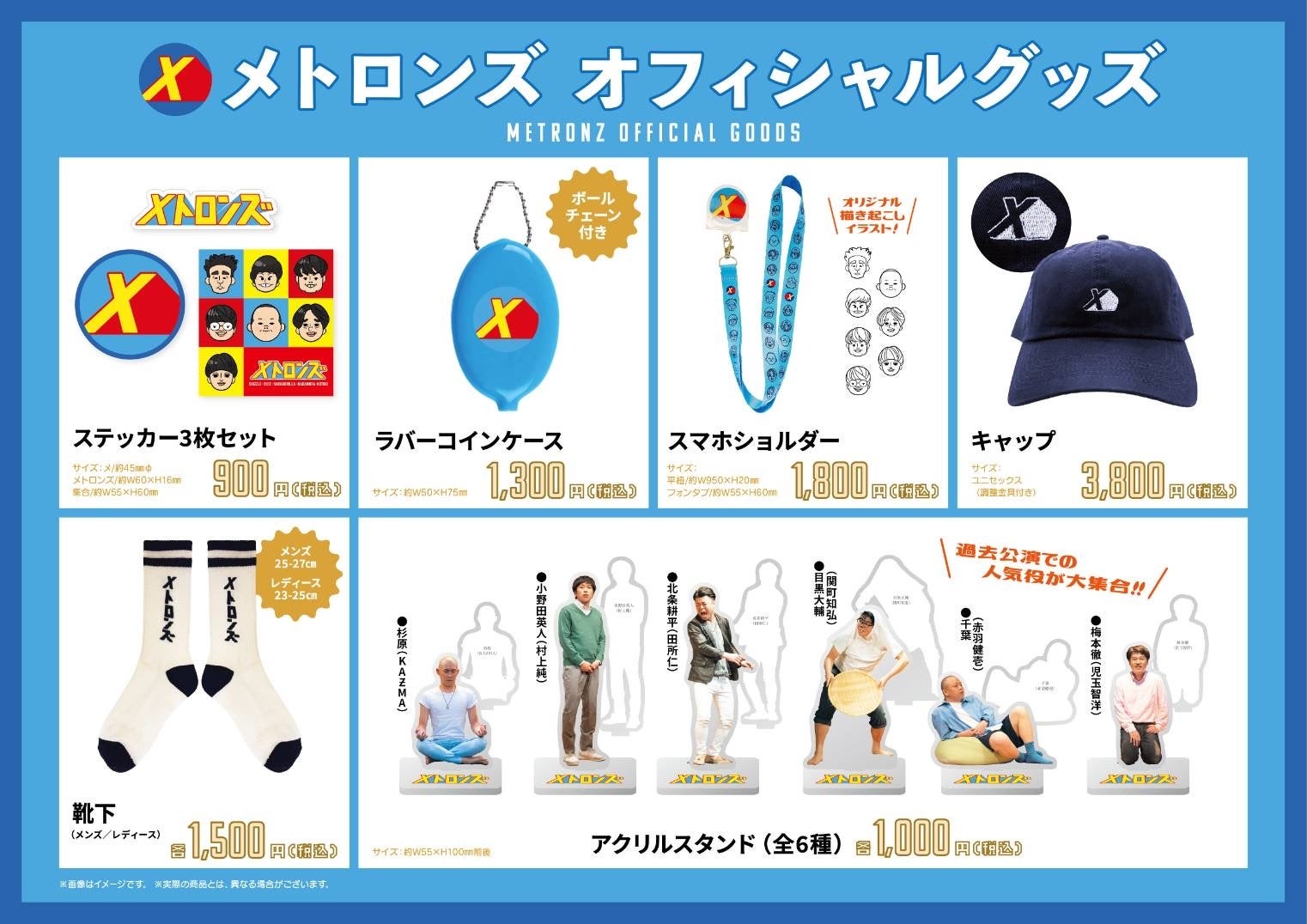 大好評をいただきました第7回公演「店出す」の公式グッズをオンラインでもご購入いただけます。グッズのラインナップは、メトロンズのロゴやイラストが描かれた可愛らしいデザインのスマホショルーや靴下、キャップ、ラバーコインケース、ステッカー3枚セットに加え、メトロンズの過去公演で人気のキャラクターの写真が印刷されたアクリススタンド(全6種)と豪華な内容です。