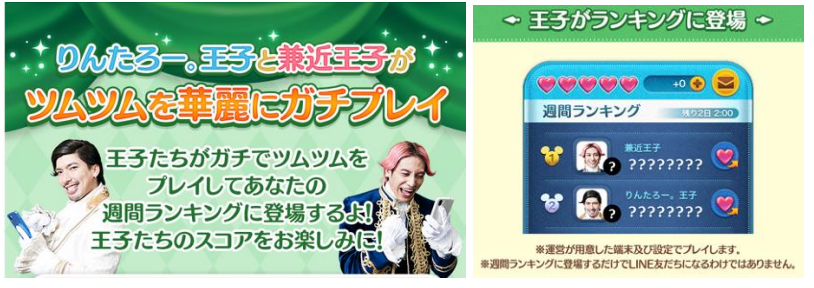 本日から放送予定の新TVCMに出演している、アゲ王国のツムツム好きなりんたろー。王子と兼近王子の2人が、本気 (ガチ)で『LINE:ディズニー ツムツム』のプレイに挑戦します。ゲーム内にある「週間ランキング」に登場し、2人がプレイしたスコアを見ることができます。また、頑張る EXITの2人にゲーム内アイテムのハートをプレゼントすることが 可能です。ハートをプレゼントしたプレイヤーは、もれなくりんたろー。王子と兼近王子からハートのお返しが受け取れ ます。
