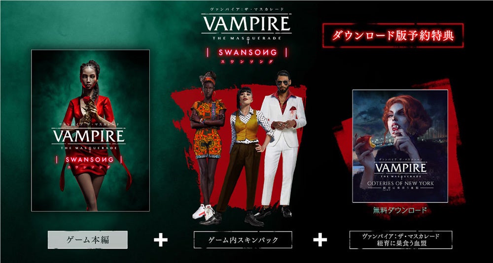 PS4/PS5デジタルデラックスエディションおよびダウンロード版の共通予約特典として、「ゲーム内スキンパック」と『ヴァンパイア:ザ・マスカレード 紐育に巣食う血盟』(PS4)をご用意いたしました。これを機に「ヴァンパイア:ザ・マスカレード」シリーズを存分にお楽しみください。