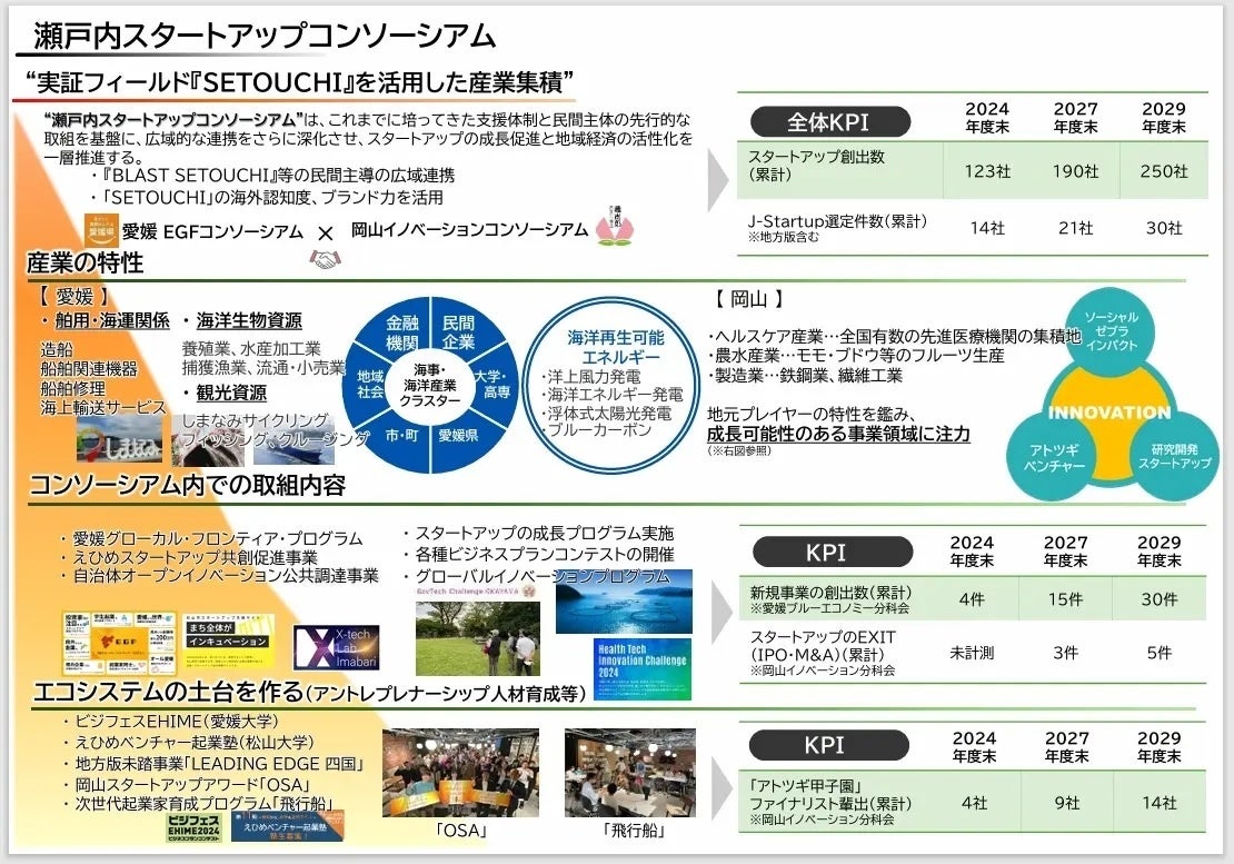 令和7年6月の内閣府の「スタートアップ・エコシステム拠点都市」制度の第2期公募において、岡山市と愛媛県が共同申請した「瀬戸内スタートアップコンソーシアム」が「NEXTグローバル拠点都市」に選定されました。同コンソーシアムは、愛媛県を中心とする「EGFコンソーシアム」と、岡山市・岡山大学を中心とする「岡山イノベーションコンソーシアム」で構成されており、瀬戸内地域において広域的なスタートアップ支援体制を構築することを目指しています。