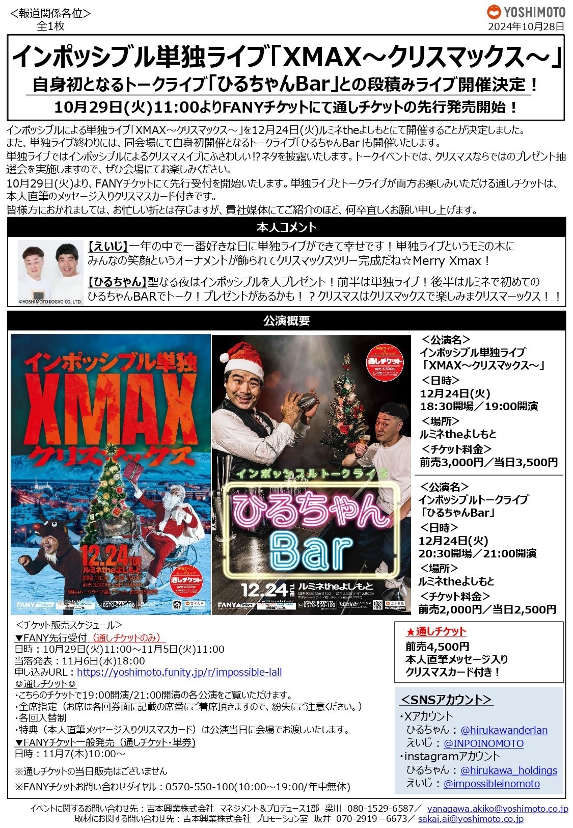 インポッシブル単独ライブ「XMAX〜クリスマックス〜」自身初となるトークライブ「ひるちゃんBar」との段積みライブ開催決定!10月29日(火)11:00より通しチケットの先行発売開始!