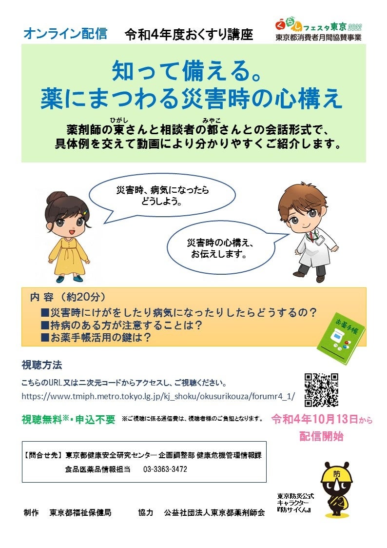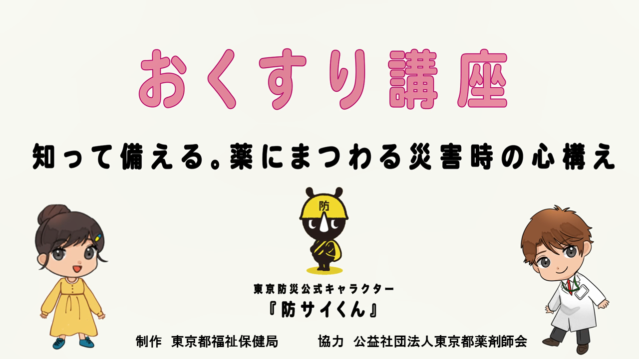 東京都では、「令和4年度 おくすり講座」として、薬にまつわる災害時の心構えについて、オンラインで、動画により分かりやすくご紹介します。ぜひご覧ください。