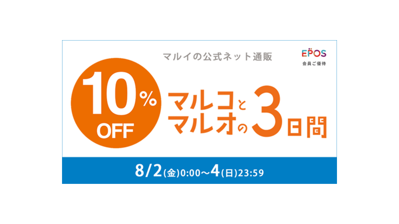 丸井グループ(東京都中野区、代表取締役社長:青井 浩)は、マルイのネット通販「マルイウェブチャネル」にて、2024年8月2日(金)~8月4日(日)の間、特別企画としてエポスカード会員さまご優待キャンペーン『ネット通販限定 マルコとマルオの3日間』を開催いたします。期間中、エポスカードのクレジット払いで10%OFFにてお買物いただけます。