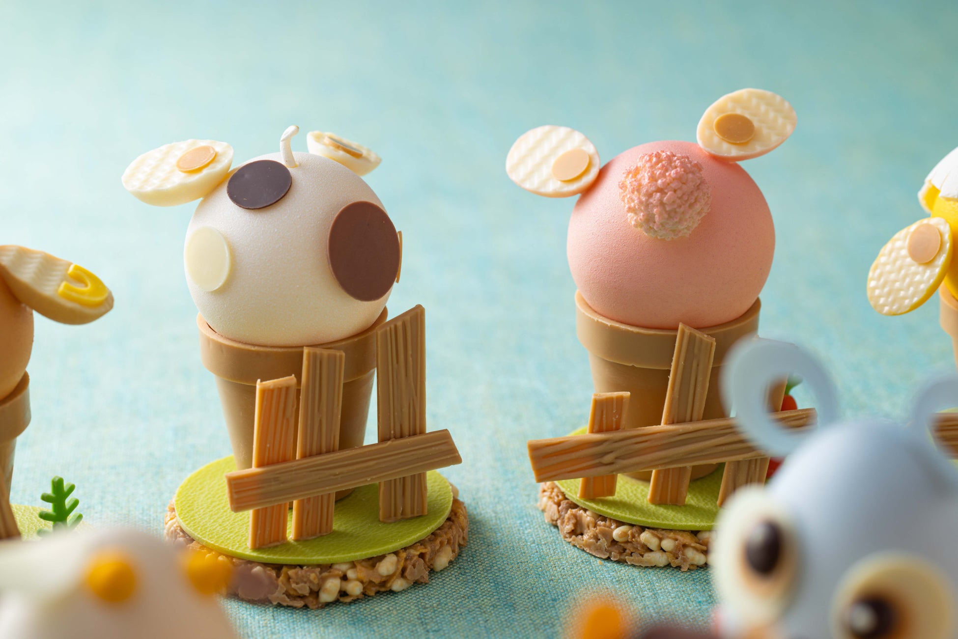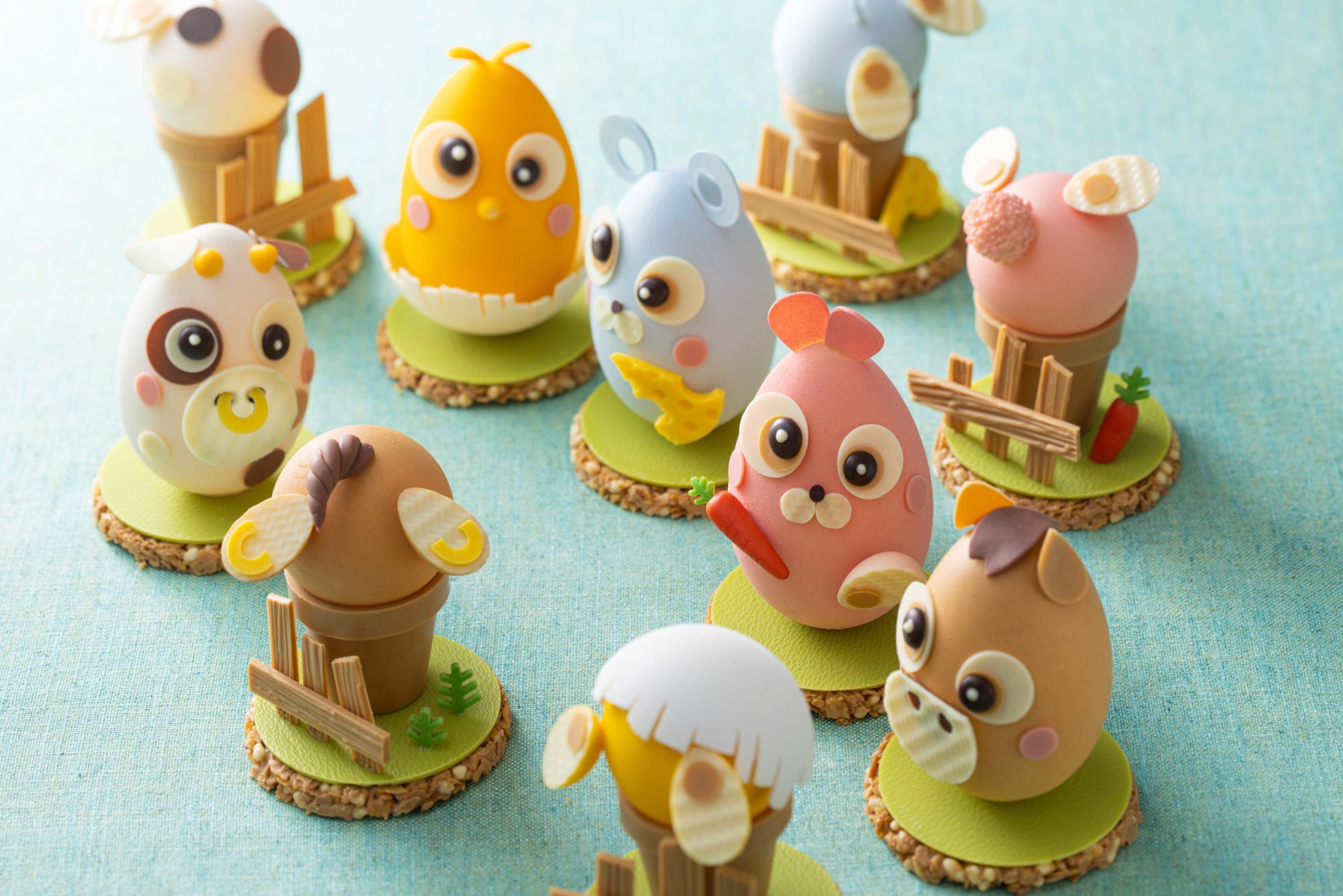 個性豊かな動物たちの表情がキュートな「イースターエッグ ショコラ」は、ホワイト、ミルク、ブロンドと3種の上質なチョコレートを使用。ホワイトチョコレートの卵の中には、キャラメリゼしチョコレートでコーティングしたマカダミアナッツとアーモンドがたっぷりと詰まっています。また、バケツに頭を入れている様子をイメージした、キュートな動物たちのおしりのデザインも。ユーモラスなシェフの遊び心が光る、思わず会話も弾む楽しいスイーツに仕上げました。