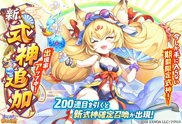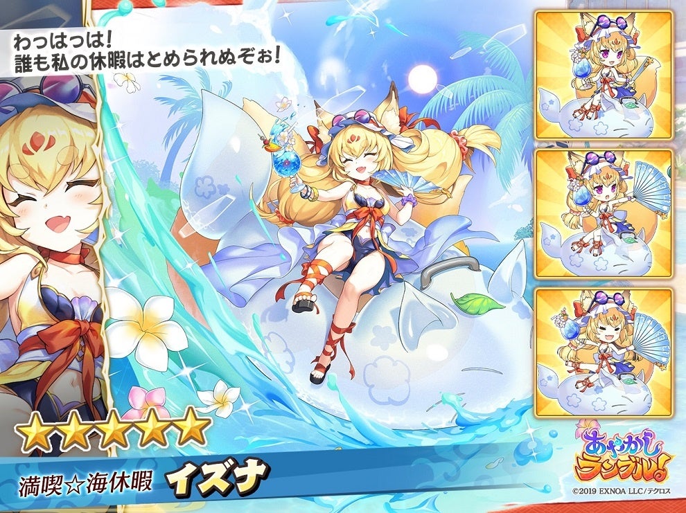 あやかし美少女RPG!DMM GAMES『あやかしランブル!』にて、最大140連!毎日無料で引ける無料10連召喚を開催!さらに期間限定「★5ミズノエ」の追加や水着衣装の「★5イズナ」も登場中!