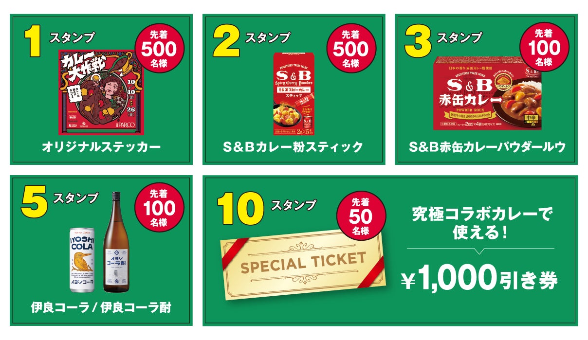 館内飲食店23店舗と豪華コラボレーション!各店のカレー&スパイスメニューを食べ歩き、豪華景品をゲット!スタンプ数により、SB赤缶カレーパウダールウや伊良コーラなどスパイスにまつわる豪華景品を進呈!!