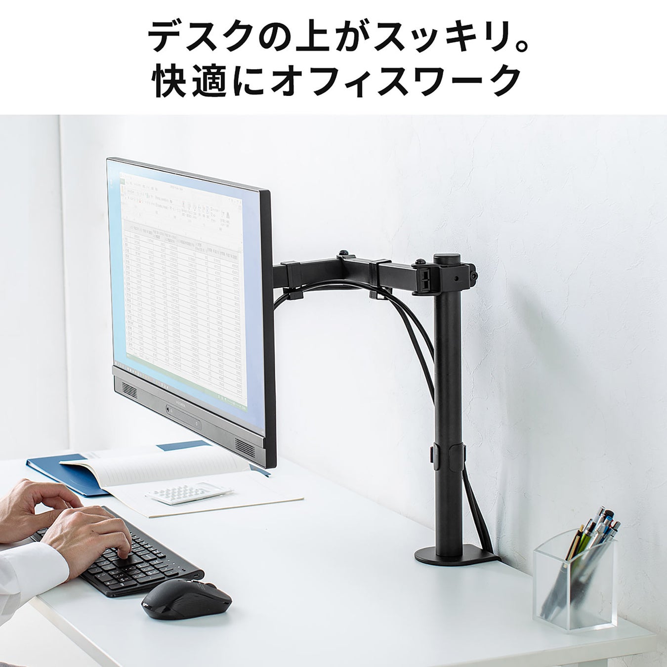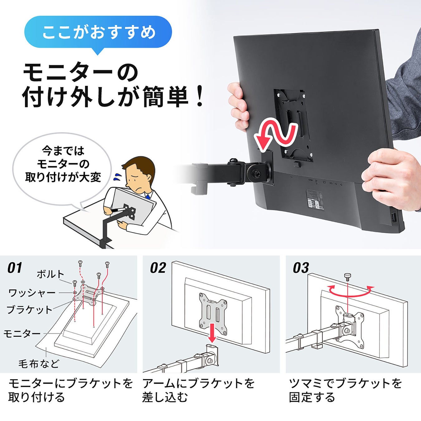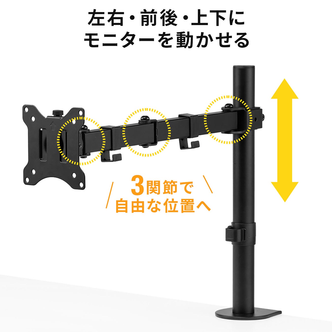 本製品は、水平空間に対して自由に可動する3関節の液晶モニターアームです。VESA規格(75×75mm、100×100mm)に準拠した液晶モニター/ディスプレイの取り付けが可能です。最大8kgまでの液晶モニタの取り付けに対応しています。