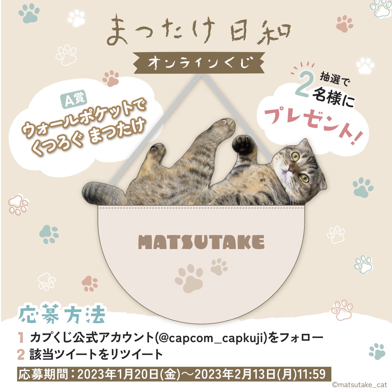 こちらは“RT賞”と題して、カプくじオンラインのアカウントをフォローし、対象のツイートをリツイートすることで、抽選で2名様に『A賞「ウォールポケットでくつろぐ まつたけ」』をプレゼントいたします! 是非この機会をお見逃しなく!