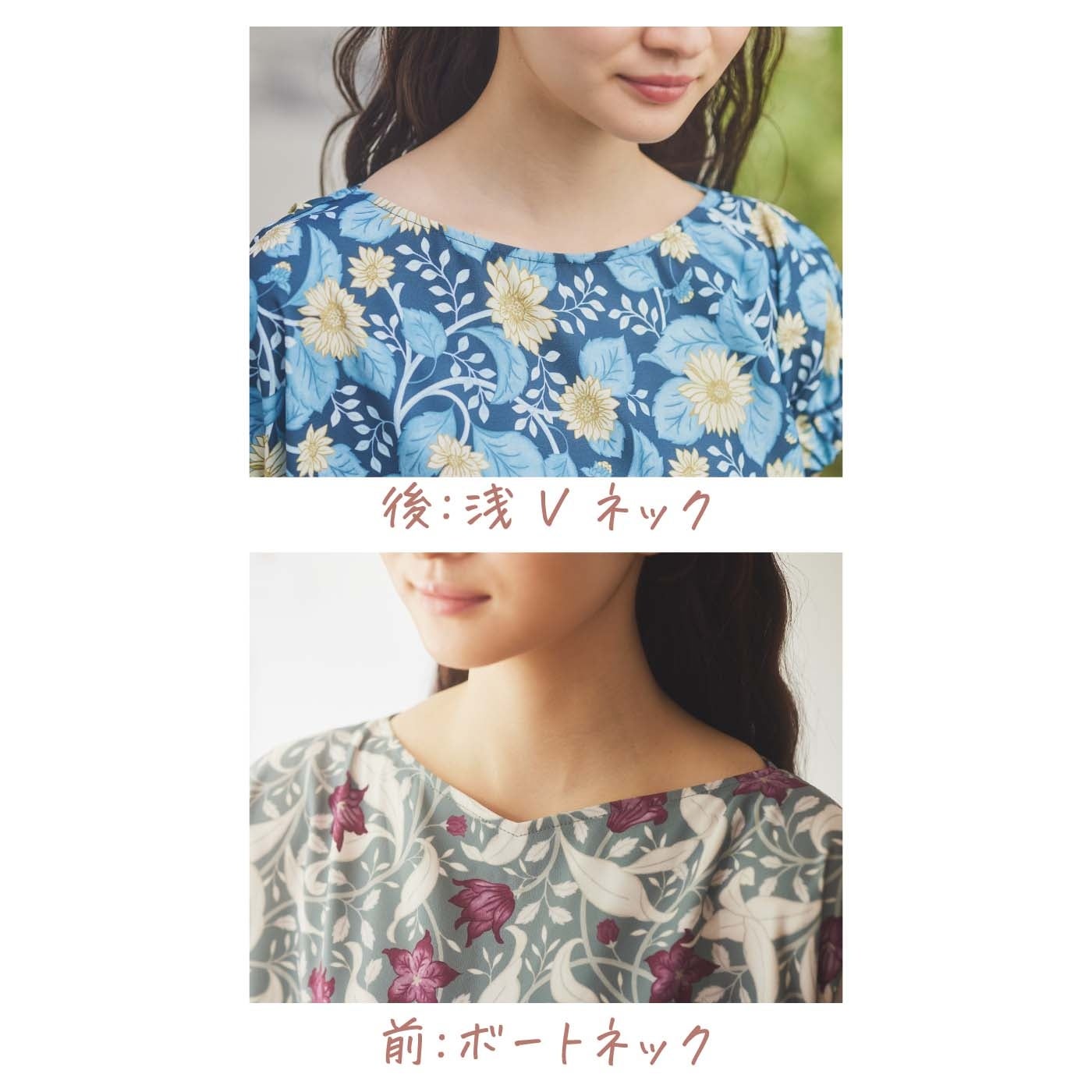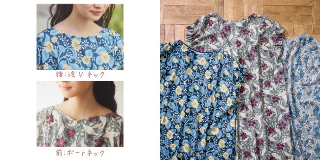 前は〈ボートネック〉、後ろは〈浅Vネック〉になっていて、前後どちらを前にしても着られるから、急いで着ても失敗しません。片側には大きめのポケットがついていて、すそはスリット入りで足さばきもよいので、パンツとの重ね着も◎。デザインは、日常でほんのりリゾート気分を味わえそうな〈ベルフラワー〉〈サンフラワー〉〈クレマチス〉の3種類です。心地よく着られて、透けが気になりにくい、ほどよい厚みもうれしいポイントです。